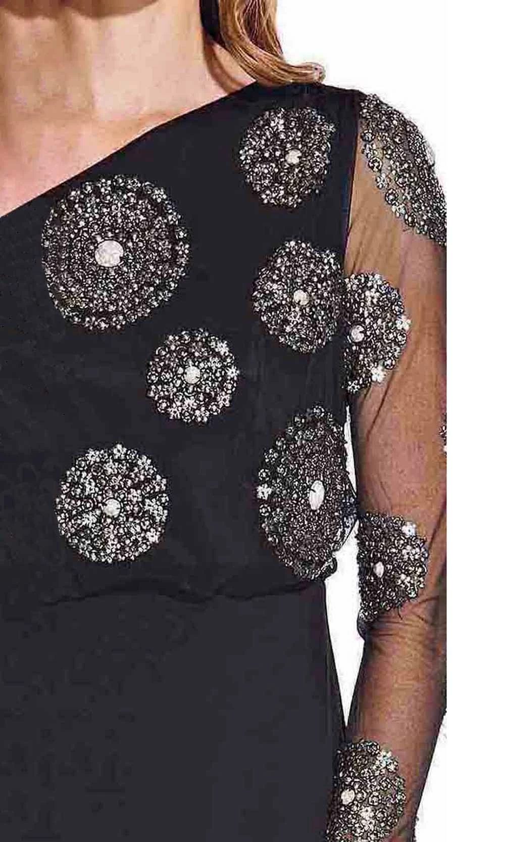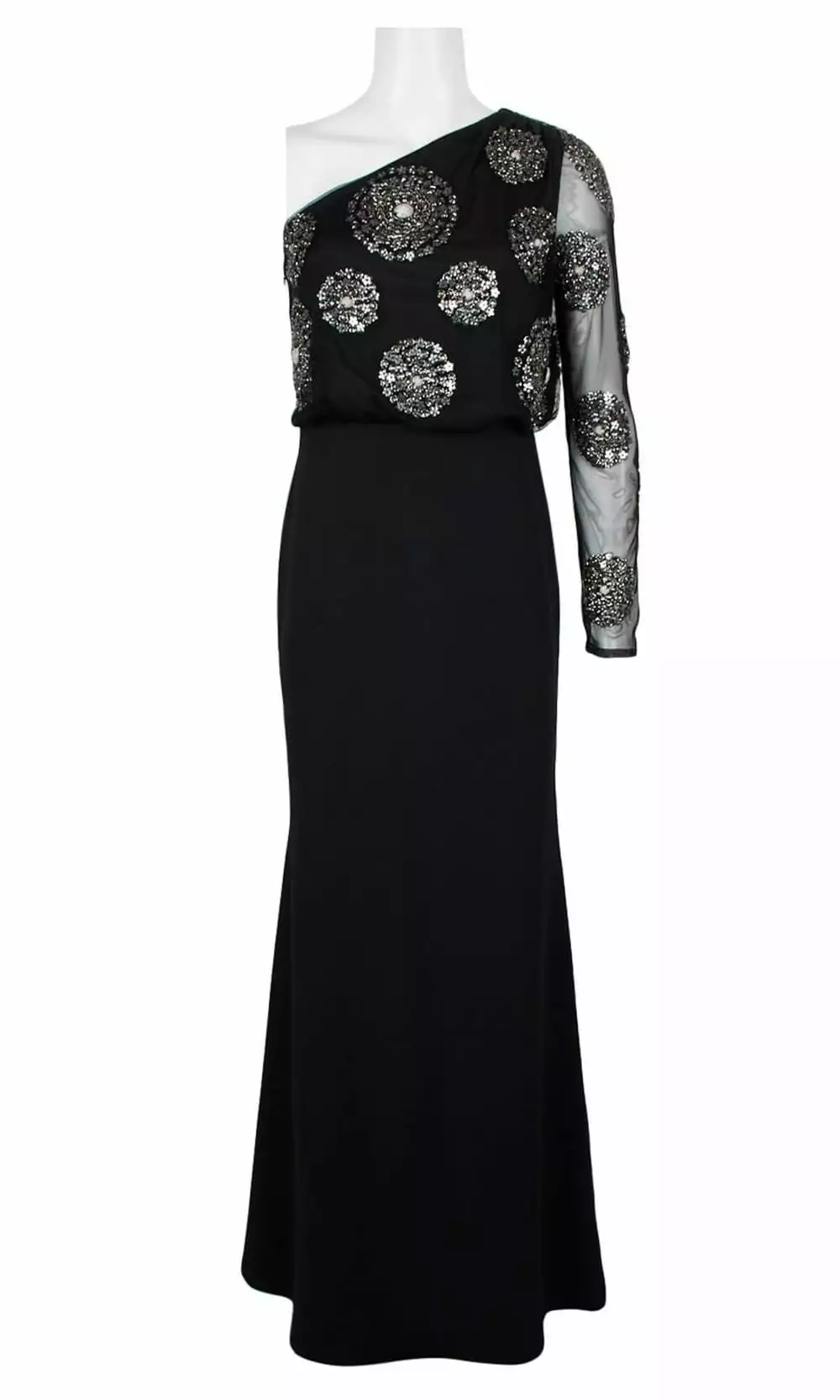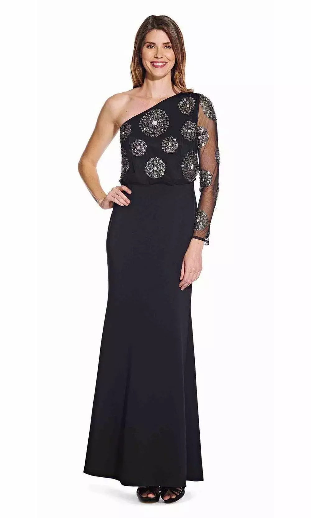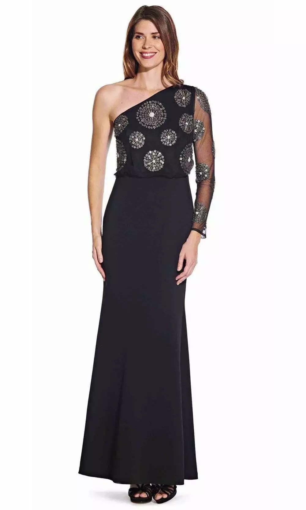 Get glam in this fabulous dress from Adrianna Papell AP1E206525. Mesmerizes in an asymmetric neckline with a single sheer long sleeve. The blouson bodice is detailed with embellishments. The skirt forms a flattering trumpet silhouette. Beam with pride when you wear this radiant dress from Adrianna Papell.