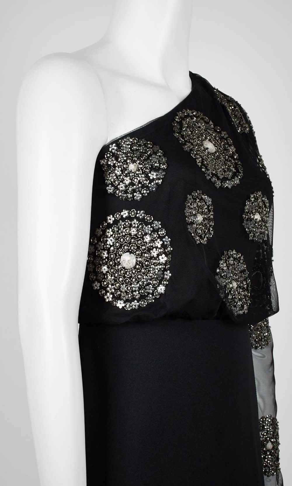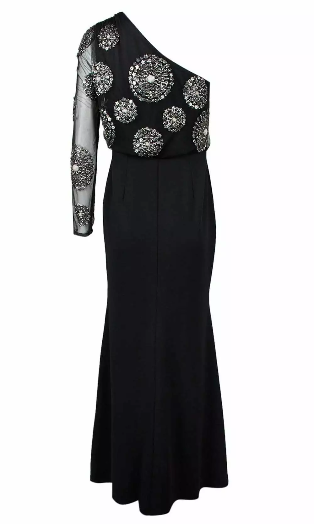 | Details: | Beaded Mesh, One shoulder, Single sheer long sleeve, Blouson bodice, Embellishments, Trumpet skirt |
