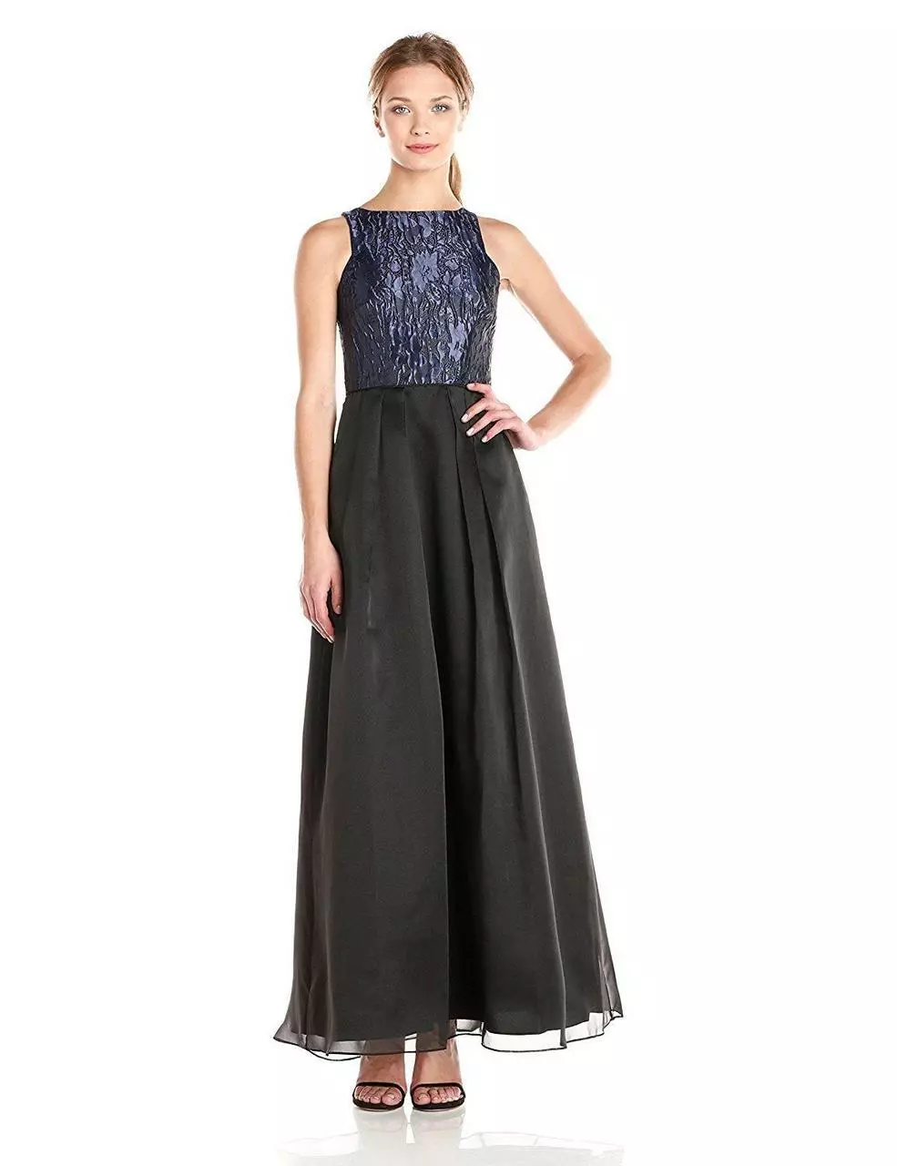 Dress to impress on your next formal event in this simple but captivating dress from Aidan by Aidan Mattox 151A10900. Features a sleeveless bateau neckline with bodice made of metallic jacquard and a pleated organza A-line skirt. This Aidan by Aidan Mattox style is a sure standout on your next evening social event.