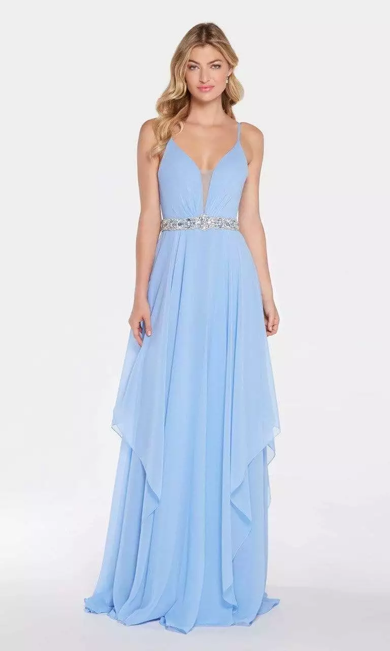 Get entangled in the romantic flair of this exquisite Alyce Paris 60092 creation as you grace your black-tie event. Designed with subtle ruching rendered in soft chiffon, this divine piece parades a plunging v-neckline supported with slender spaghetti straps and overlaid with an illusion modesty inset. Beautifully cut with a deep v-shaped back, shimmering jewels in a floral design hugs the natural waist. The chiffon A-line skirt reveals soft ripples as it cascades down to an asymmetrically hemmed full-length silhouette. Shine among the iridescent stars of the night in this glamorous Alyce Paris masterpiece. Model is wearing the Periwinkle color.