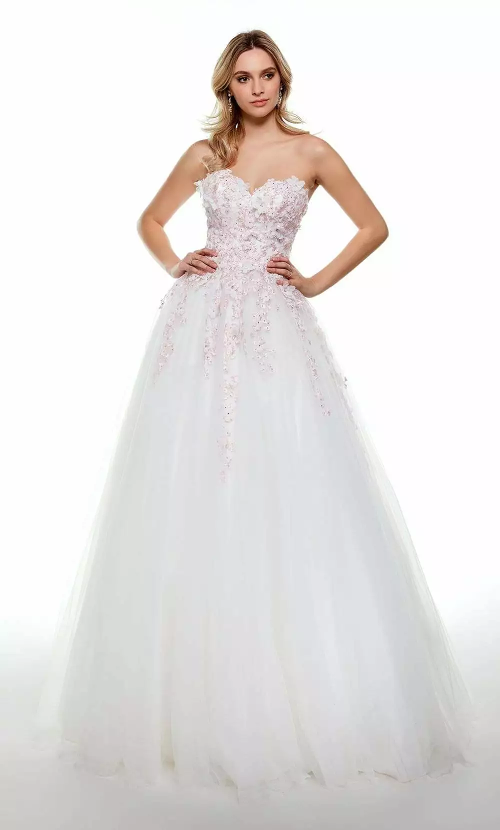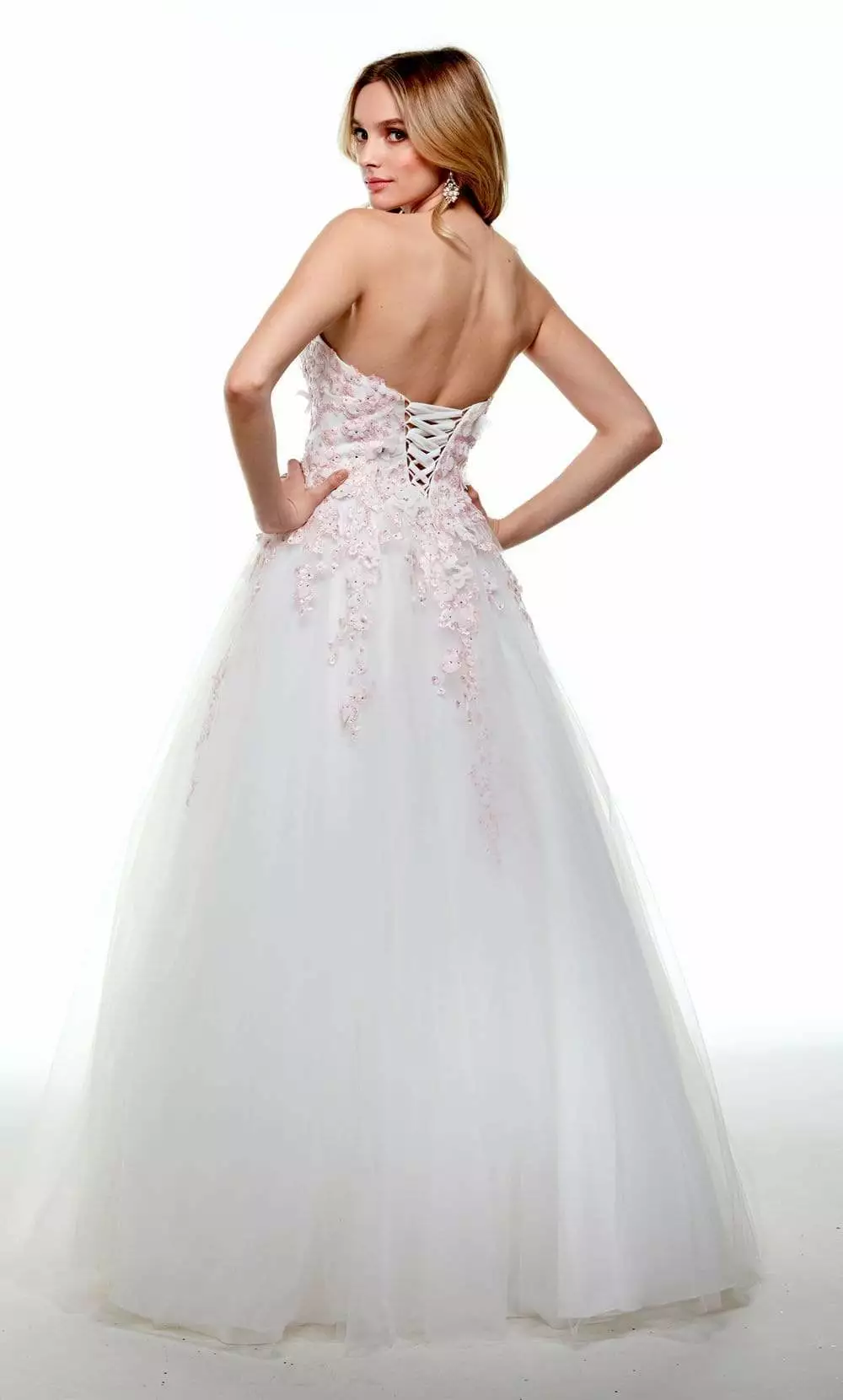 Appear like a modern princess in this enchanting Alyce Paris 6802 gown. This strapless tulle ballgown is embellished with 3d floral applique in a wonderful detailing. It features a sweetheart neckline over a fitted bodice and a corseted lace-up back. Make it your moment to shine in this beautiful gown from Alyce Paris. The dress is pictured in Diamond White/Black and Diamond White/Pink colors.