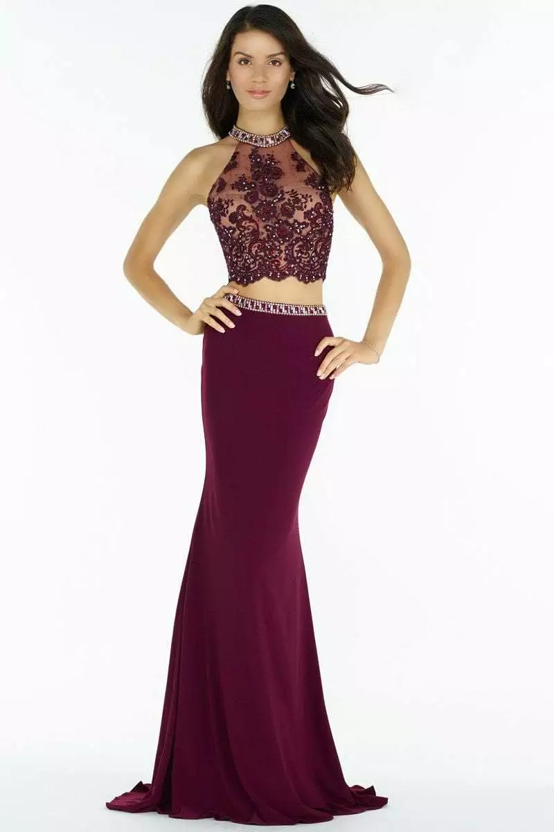 Beautiful two piece with a long jersey skirt embellished at the waist, laced halter top with a large keyhole back and a small tail.