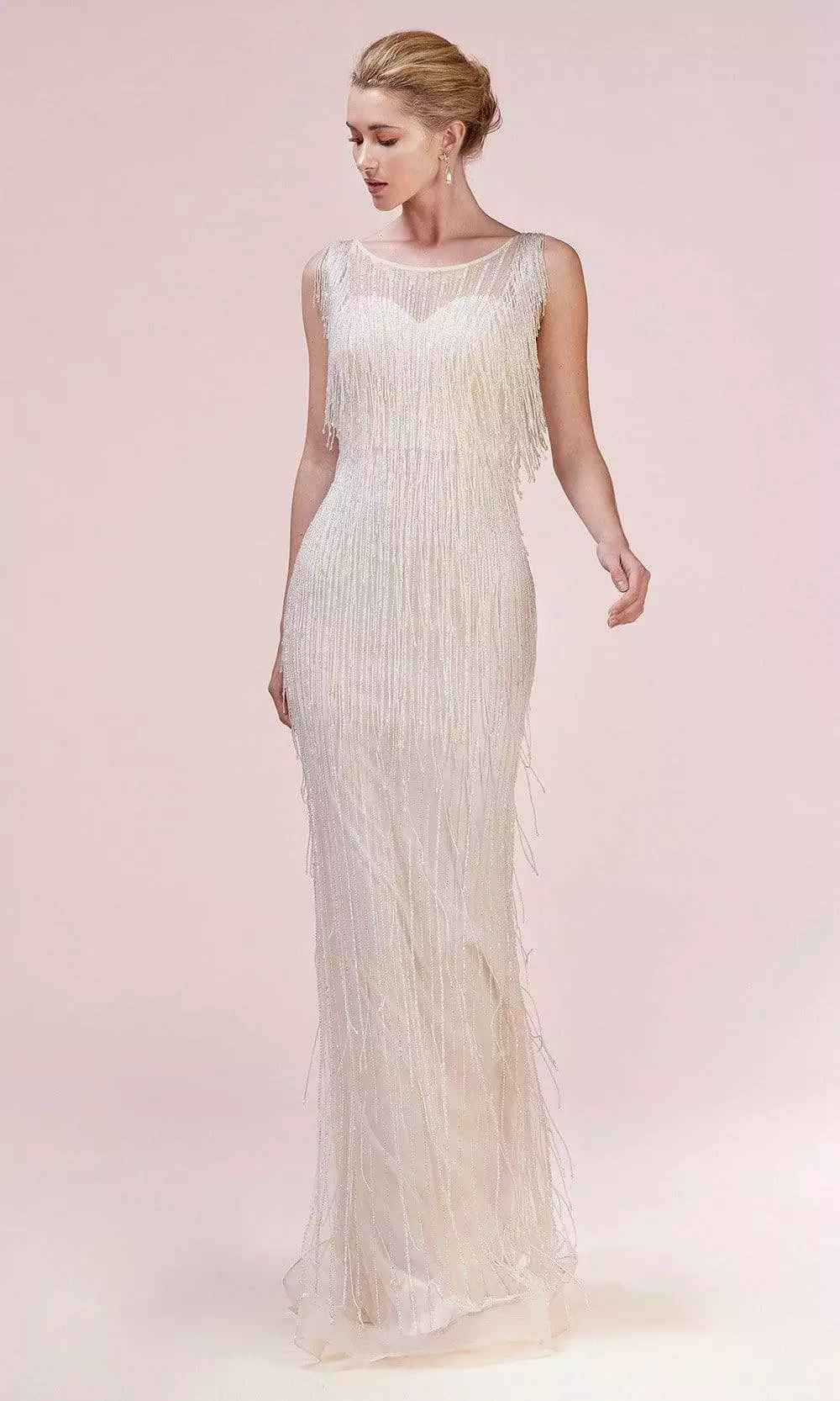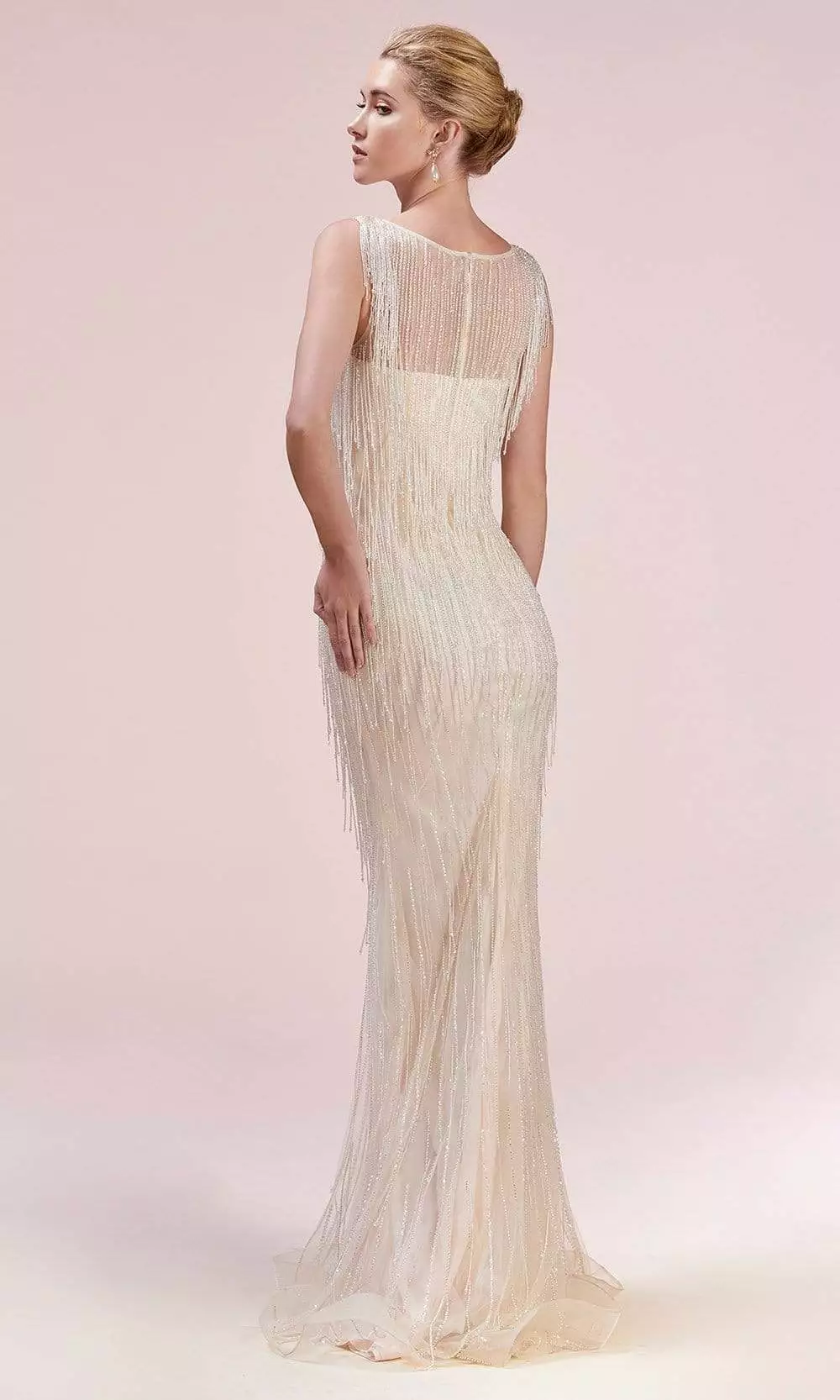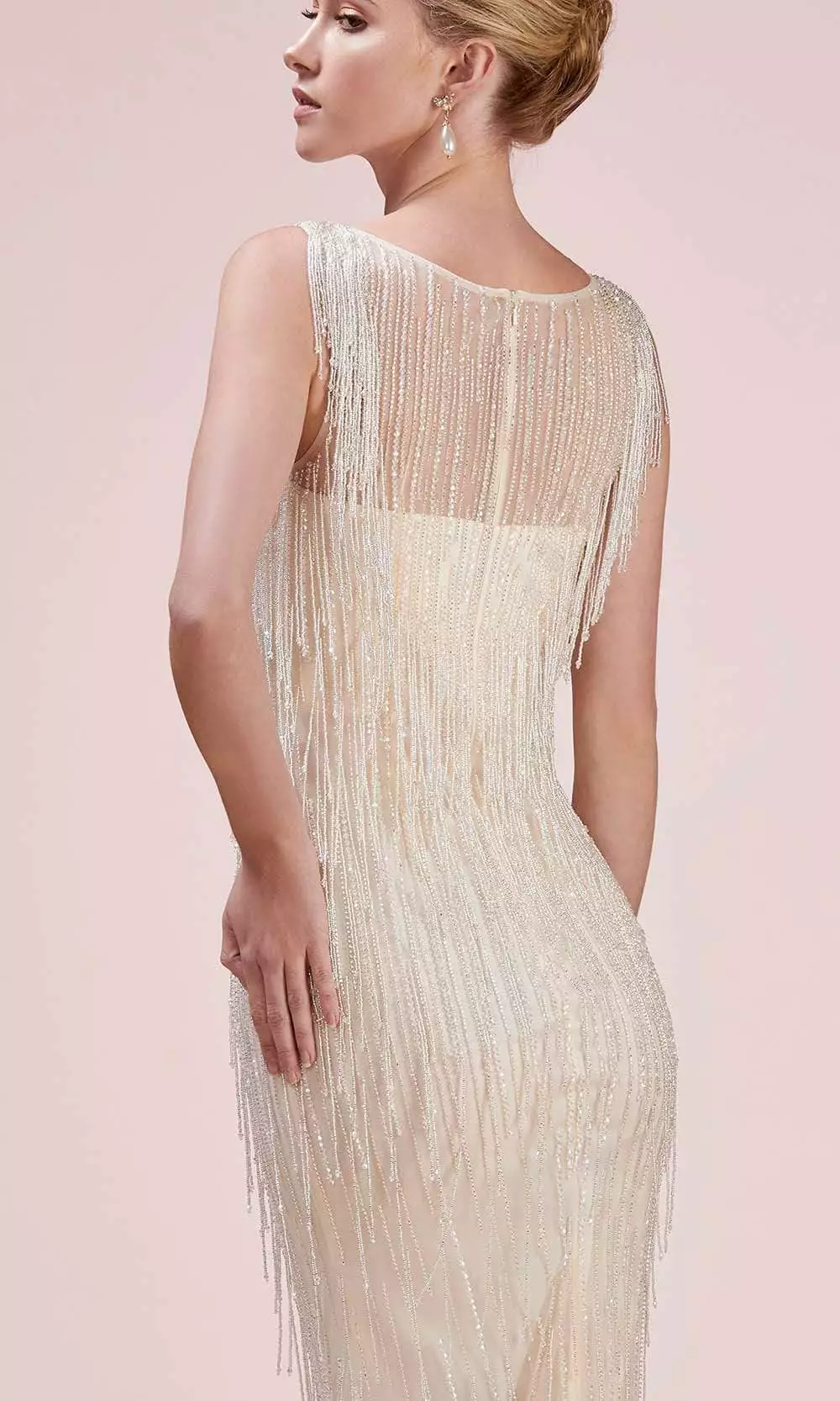 | Details: | Bead-Fringed, Sleeveless, Sheer Full Back, Back Zipper Closure, Sweep Train |