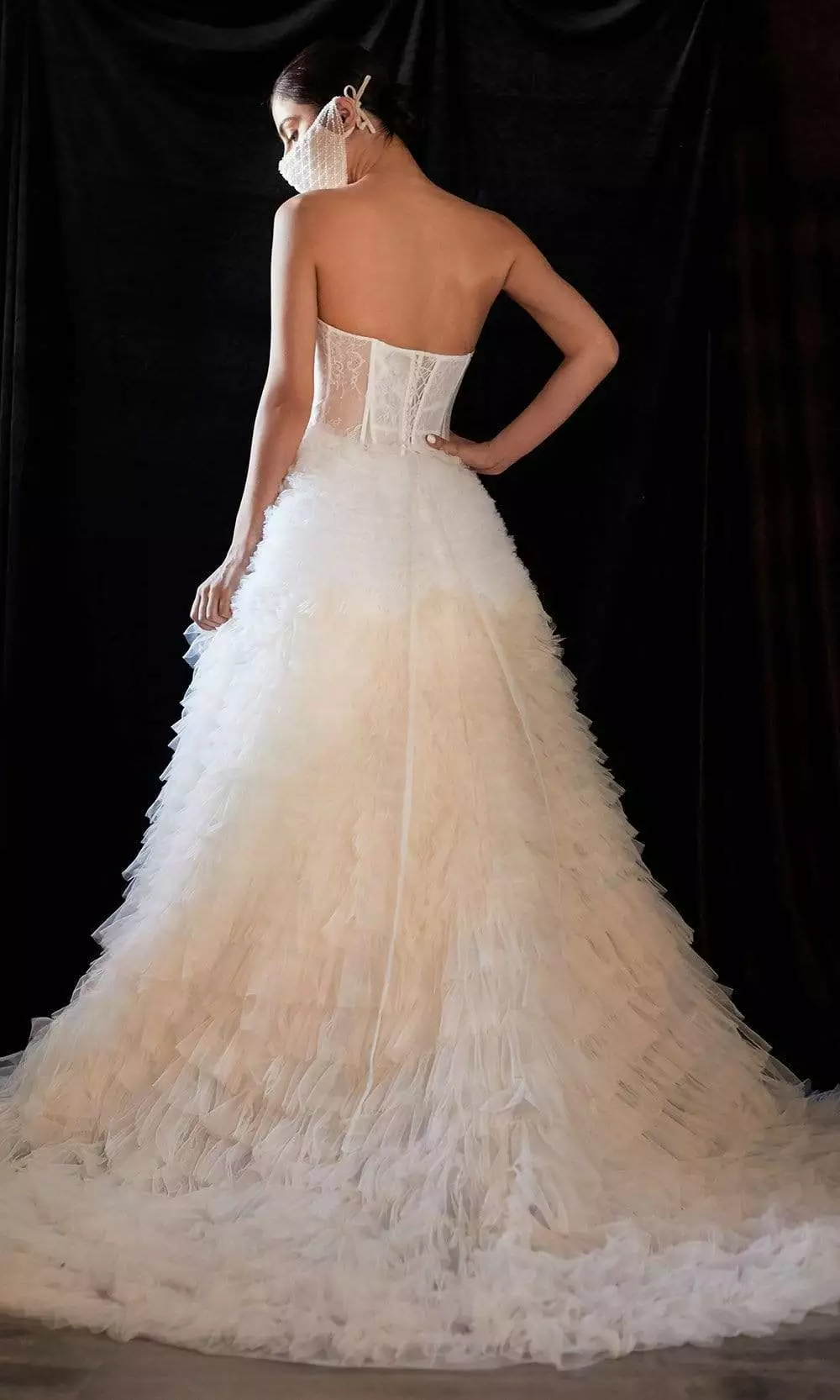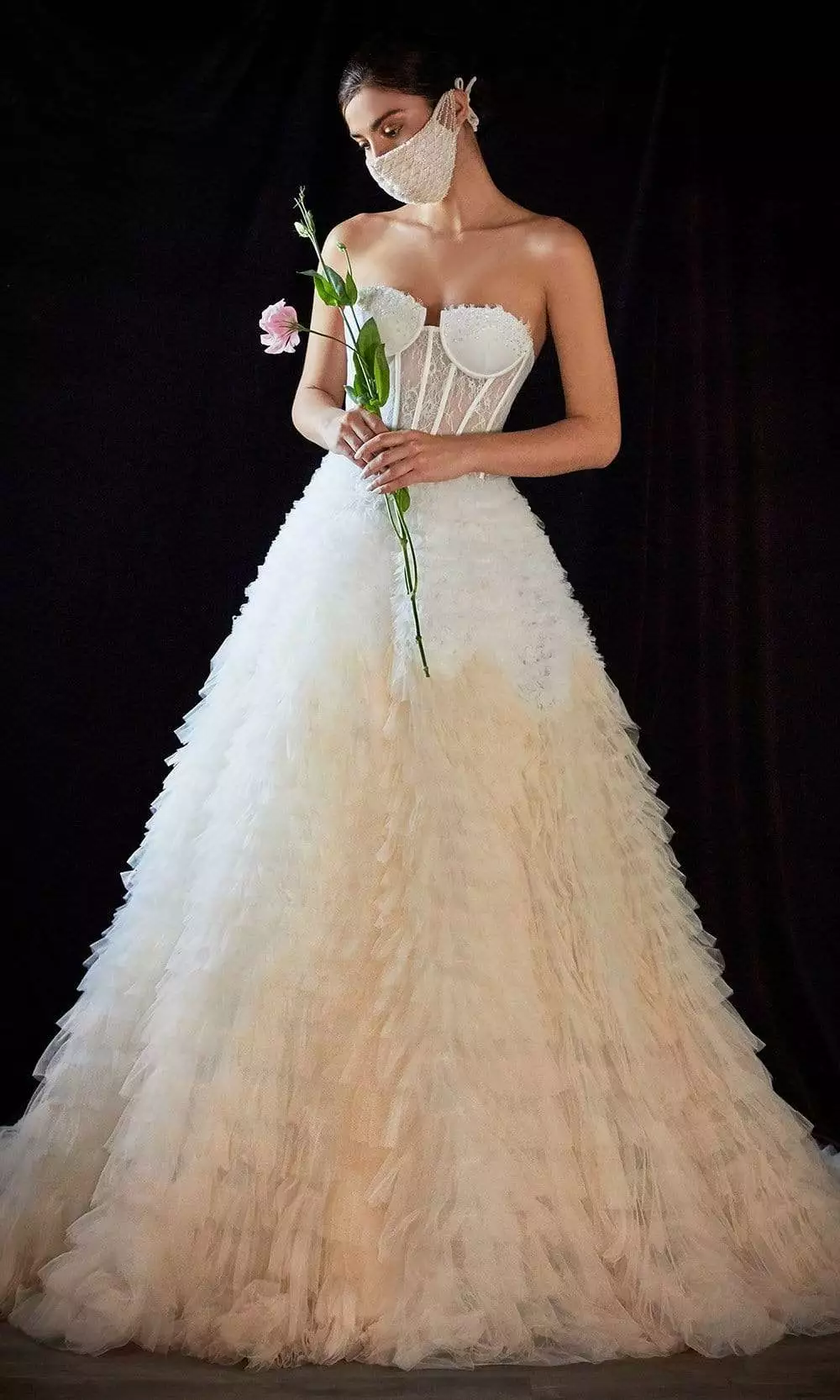 | Fabric: | Chantilly, Glass beading, Eyelash lace, 2-color ombre, Tulle ruffles |