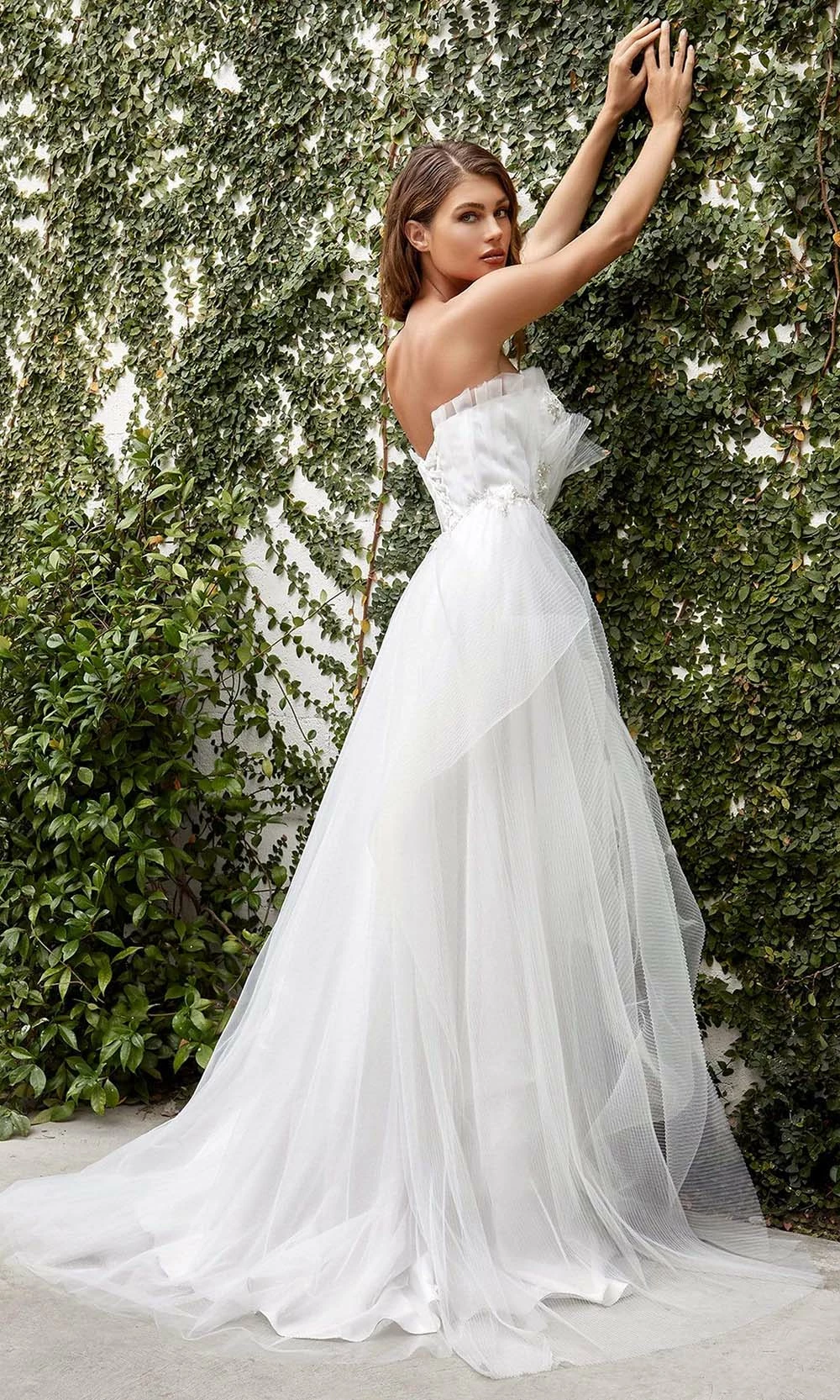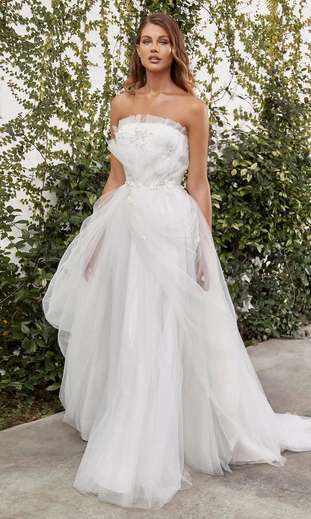 Flourish stunning elegance on your wedding day in this impeccable Andrea and Leo A1015W creation. Defined with a pleat-ornate crumbcatcher bodice, this strapless gown parades a straight-across neckline with a lace up back. Beautifully draped with tulle and ornate with beads, the sumptuous skirt flows into a lush train. Expect to be turning heads when you walk down the aisle in this Andrea and Leo masterpiece.