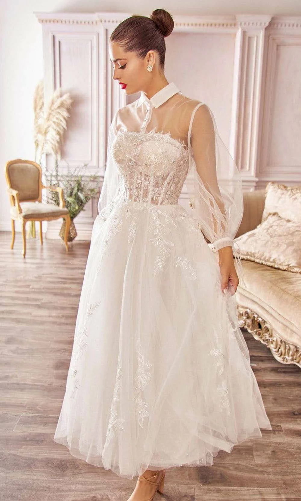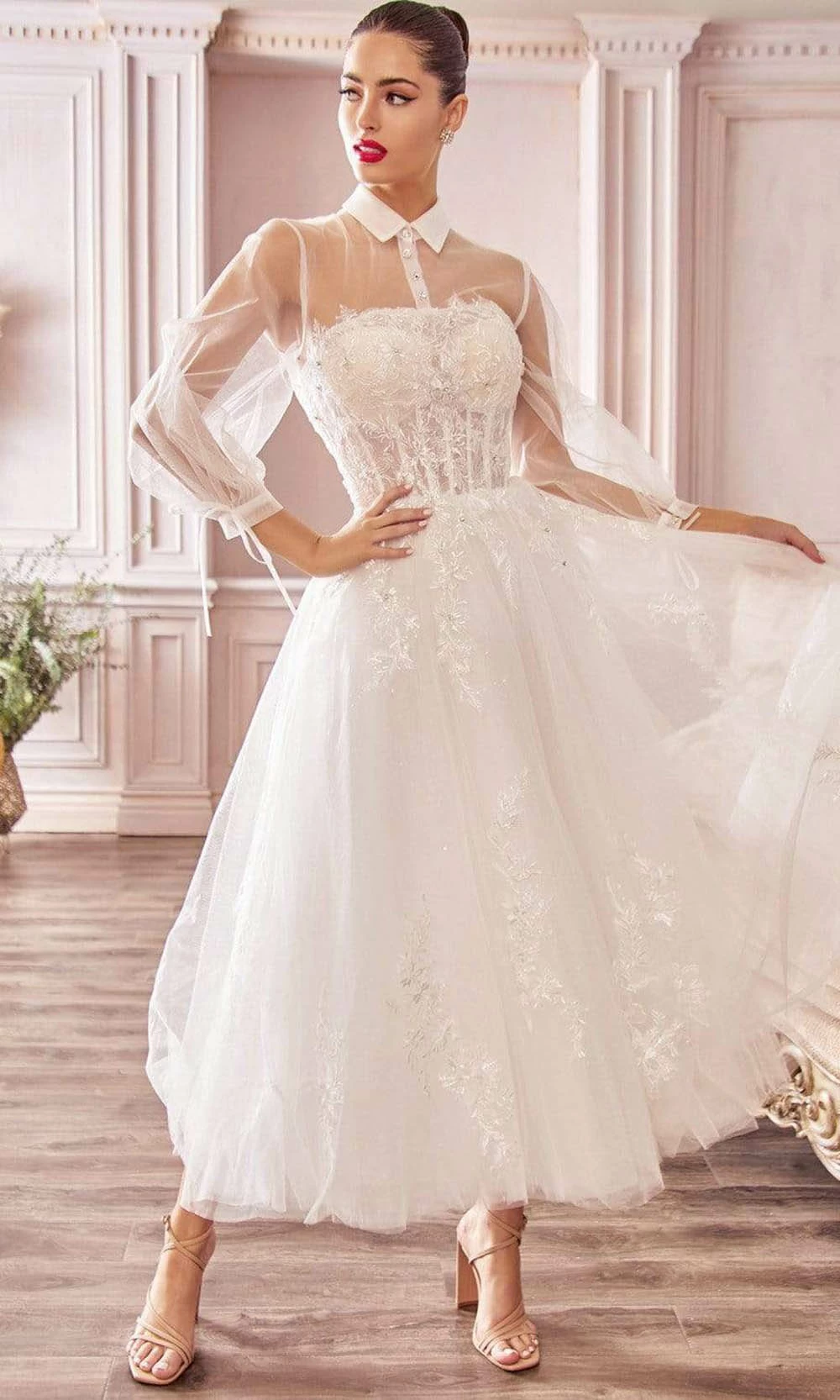 Step out in a gorgeous gown from Andrea and Leo A1016. Perfect for non-traditional weddings and a trendy collared dress in a bishop sleeve. Bodice uses corset and embellished while using sheer fabric on the blouson. Cut in tea-length in an A-line silhouette using tulle fabric. Andrea and Leo making it well-suited for both petite and curvy brides who want a chic, classic look.