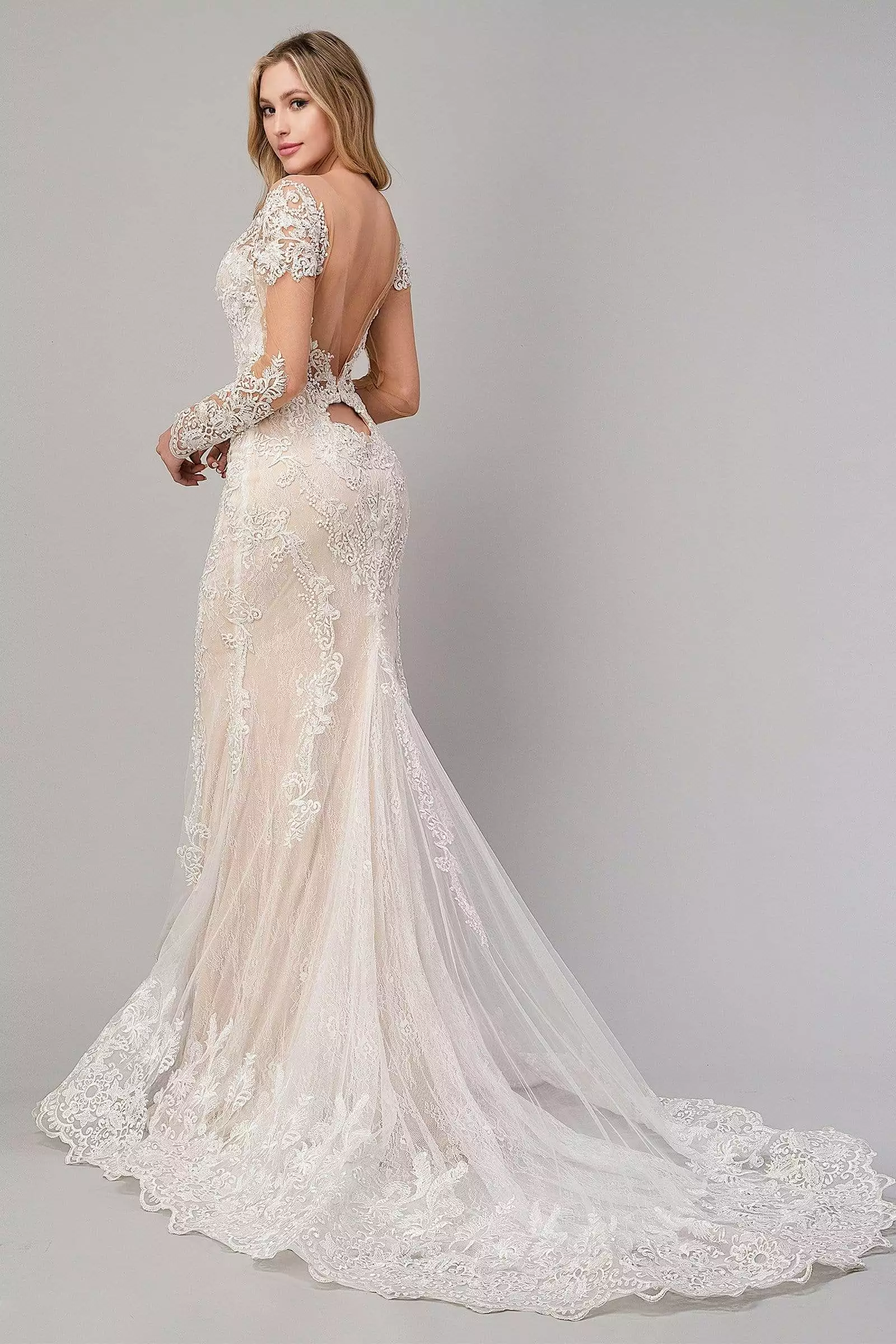 Fascinate him as you walk down the aisle wearing this exceptional Andrea & Leo A1022 masterpiece. This dress offers an illusion effect and is embellished with bridal embroidery throughout. It uses lace fabric and long sheer sleeves and a sexy open back perfect for modern brides. It parades a figure-hugging trumpet silhouette with a sweep train finish. Andrea & Leo wedding dress evokes princess-inspired elegance in a soft and romantic Andrea & Leo silhouette.