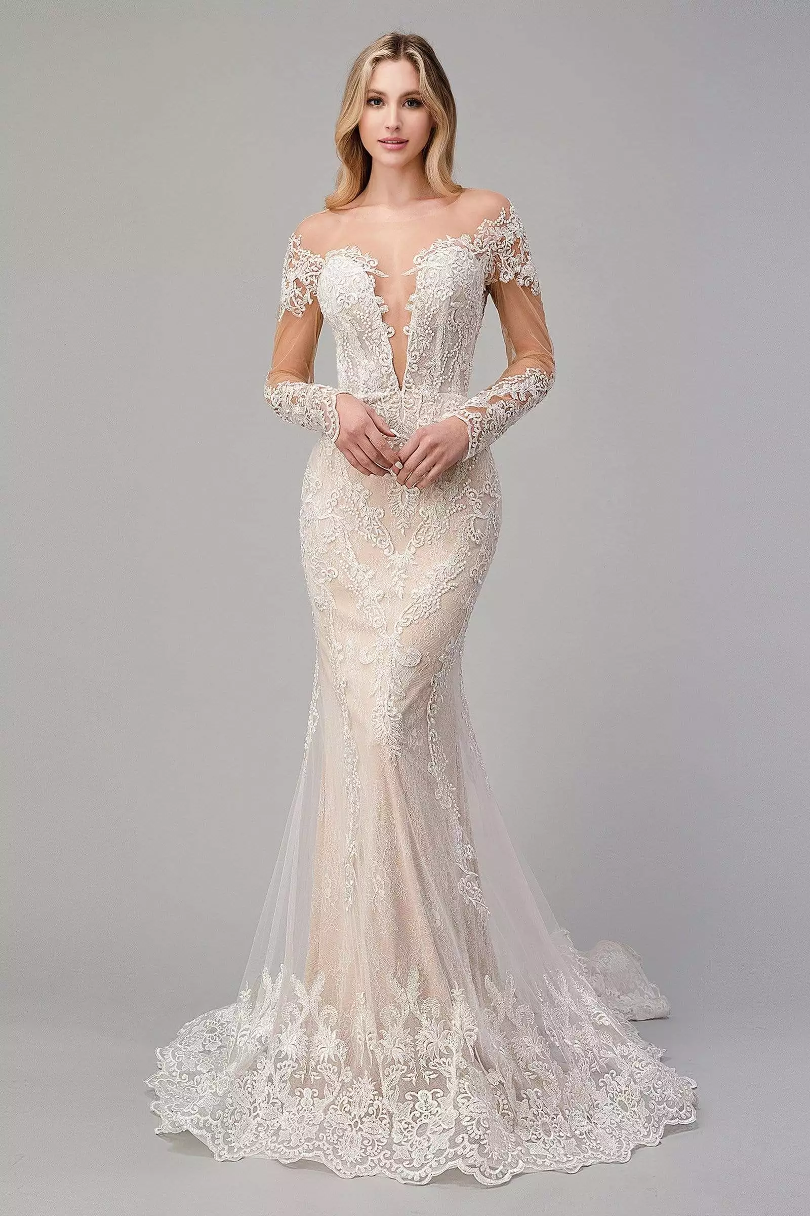 | Details: | Sheer, Lace, Embroidery, Plunging neckline, Fitted bodice, Open back, Scallop hem, Bridal dress, Floor length, Sweep train |