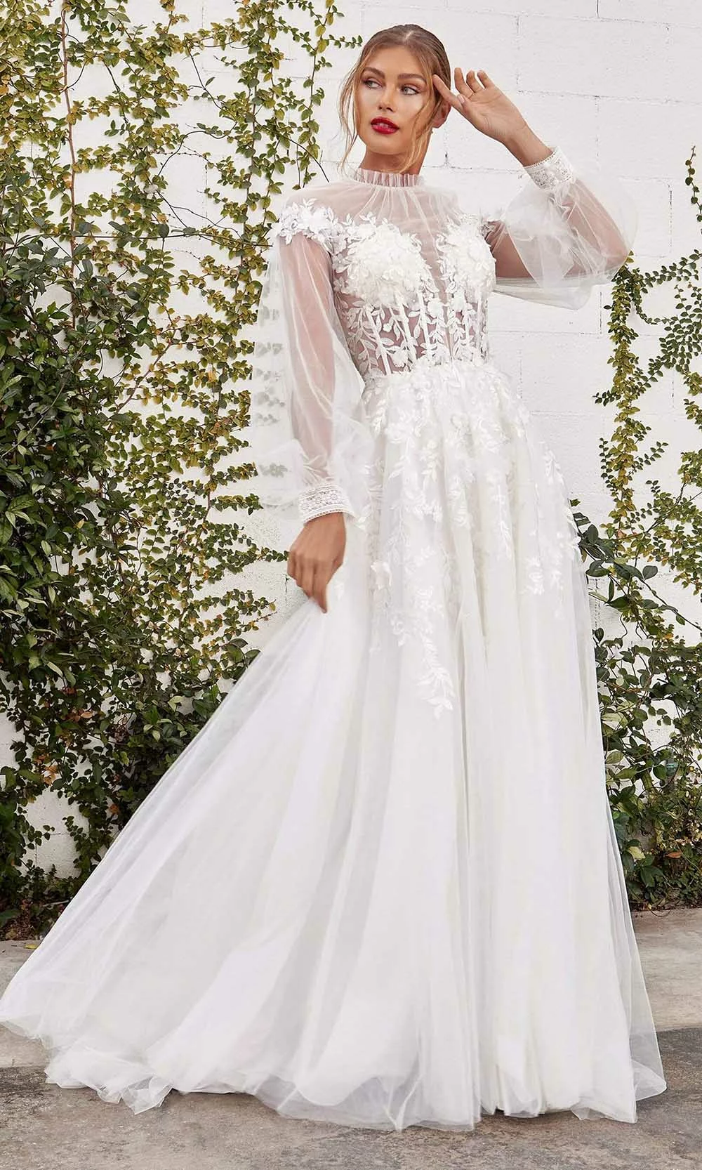 Look every bit like a dream as you walk down the aisle in this Andrea and Leo A1074W creation. Trailing with lace embroidered details and beadwork, this refined stunner flaunts a shirred illusion high neckline with a button ornate back. Ornamented with sheer bishop sleeves and lace embroidered cuffs, this sheer corset piece reveals a skirt that flows into a court train. Impart a sense of sophistication in this Andrea and Leo masterpiece.