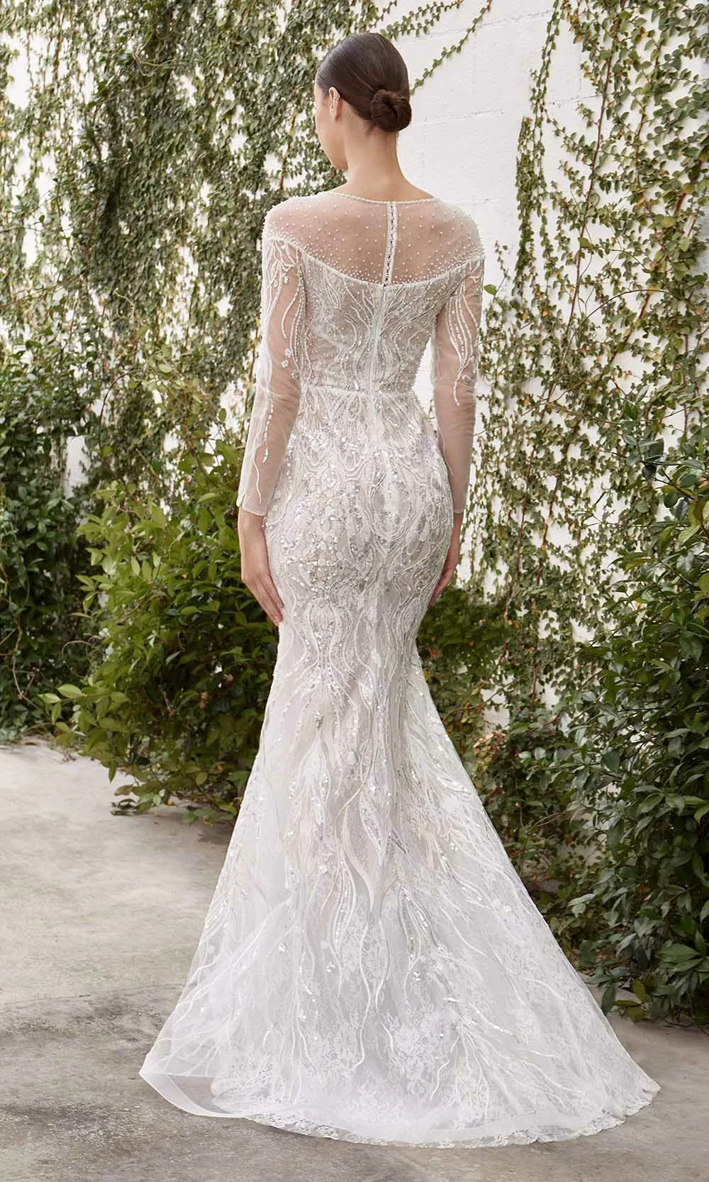 Charm everyone on your wedding day in this flattering Andrea and Leo A1085W creation. Festooned with sprinkled jewels on a lace silhouette, this gown features an illusion jewel neckline with long sleeves. Revealing a sweetheart plunge and a sheer back, the mermaid skirt sculpts and flares into a train. Be swept away by the romance of this Andrea and Leo masterpiece.