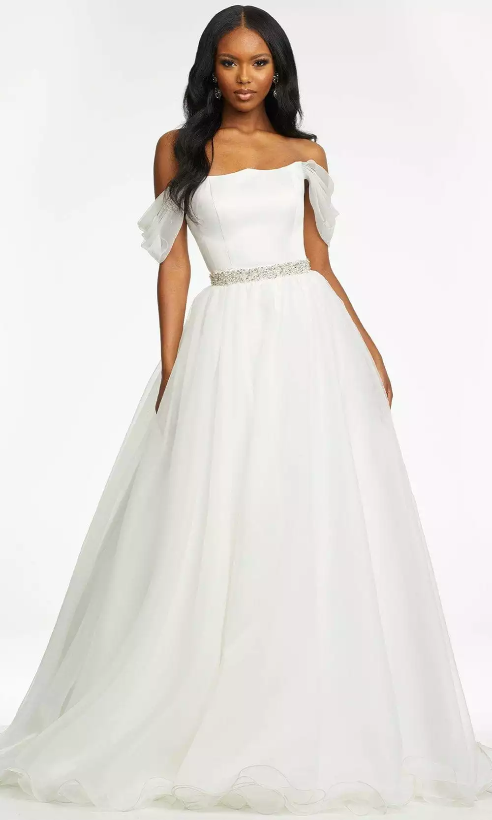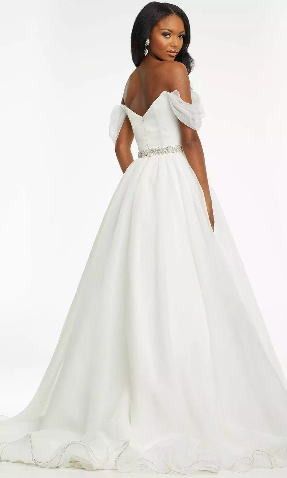Brave the evening with temptress beauty and grace wearing Ashley Lauren 11129 creation. This stunning gown features a draped off shoulder and modified sweetheart neckline, complemented with V back. The natural waist is accented with a crystal beaded belt while the skirt parades a long and voluminous ballgown silhouette, finished off with a sweep train. You are statuesque in a posed gown from Ashley Lauren. Model is wearing Ivory color. Ashley Lauren is one of the most popular brands to look for this year offering endless options in special occasion dresses.