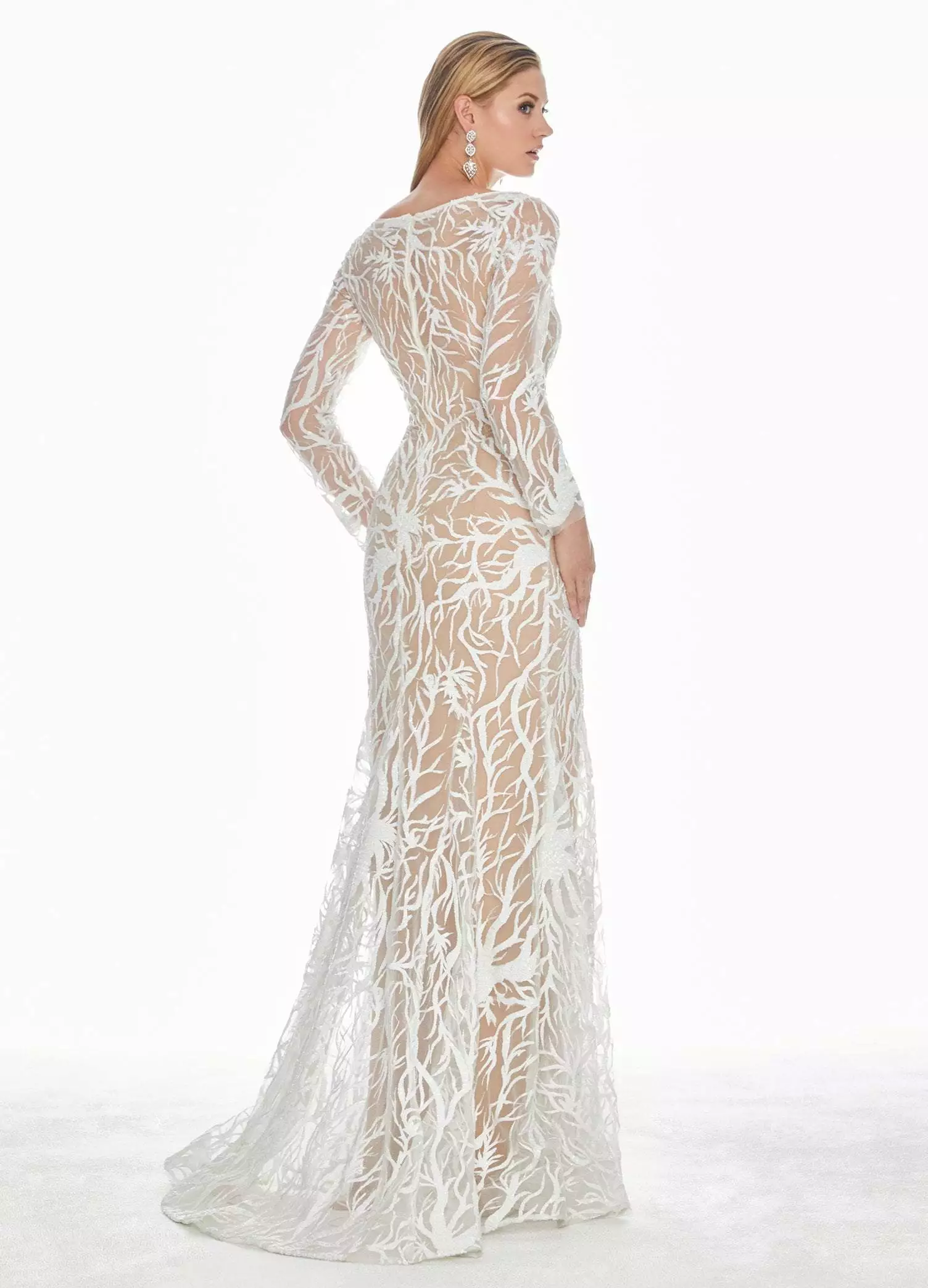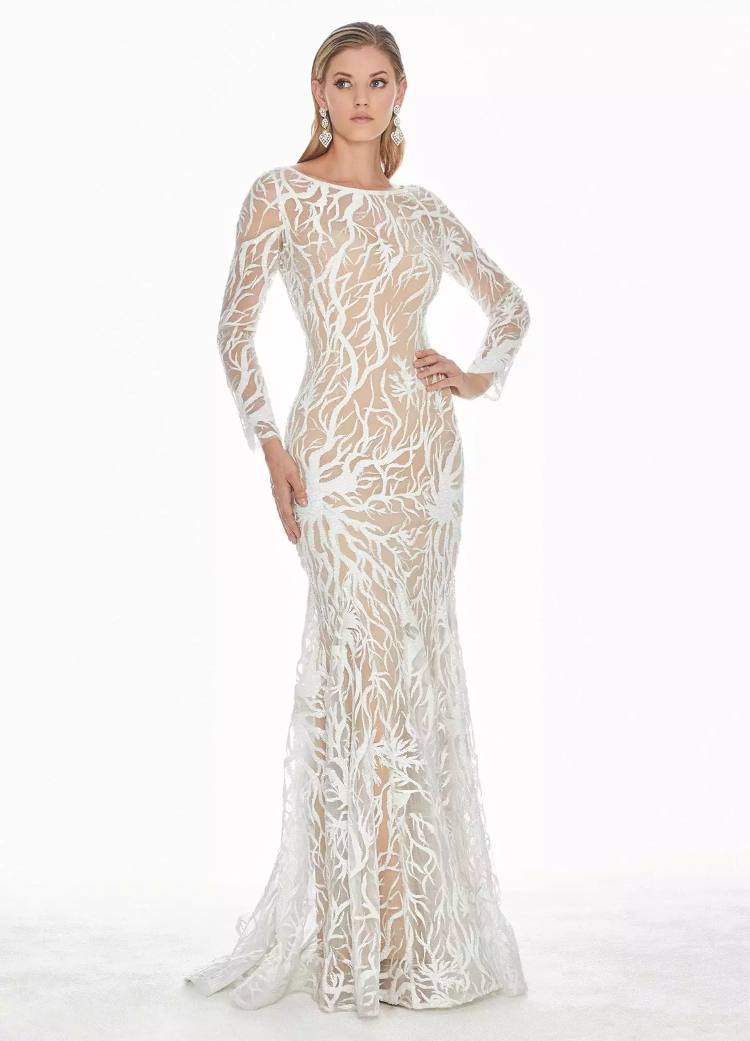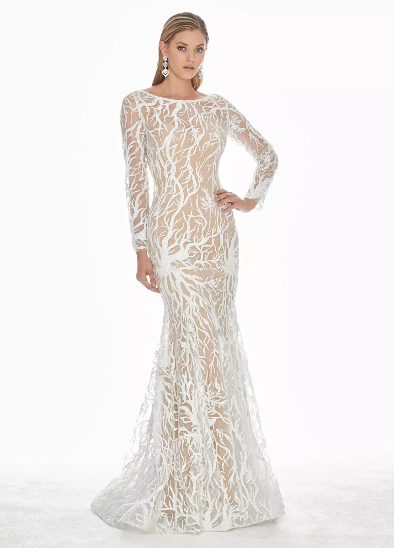 Show off your sexy side in this long sleeve white sequin evening dress from Ashley Lauren 1349. This form-fitted style is made from a sequin fabric that has been perfectly placed to accentuate your curves on top of a nude jersey lining. The dress has a bateau neckline with sheer long sleeves. The fitted bodice gives way to a full length trumpet skirt with a sweep train finish. Turn yourself into a head-turning sensation by slipping into this utterly fetching Ashley Lauren design.