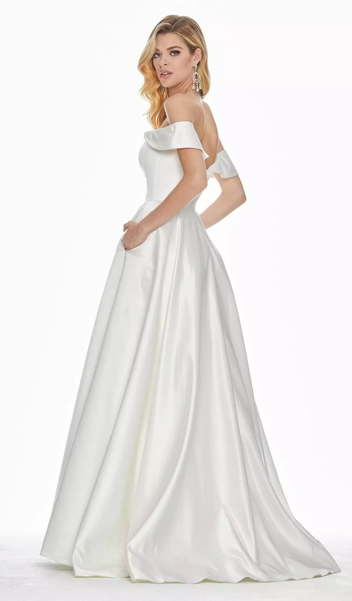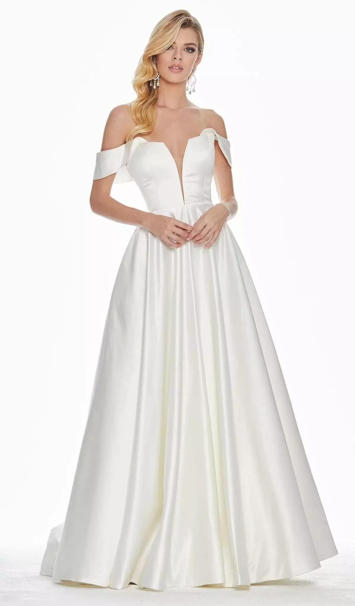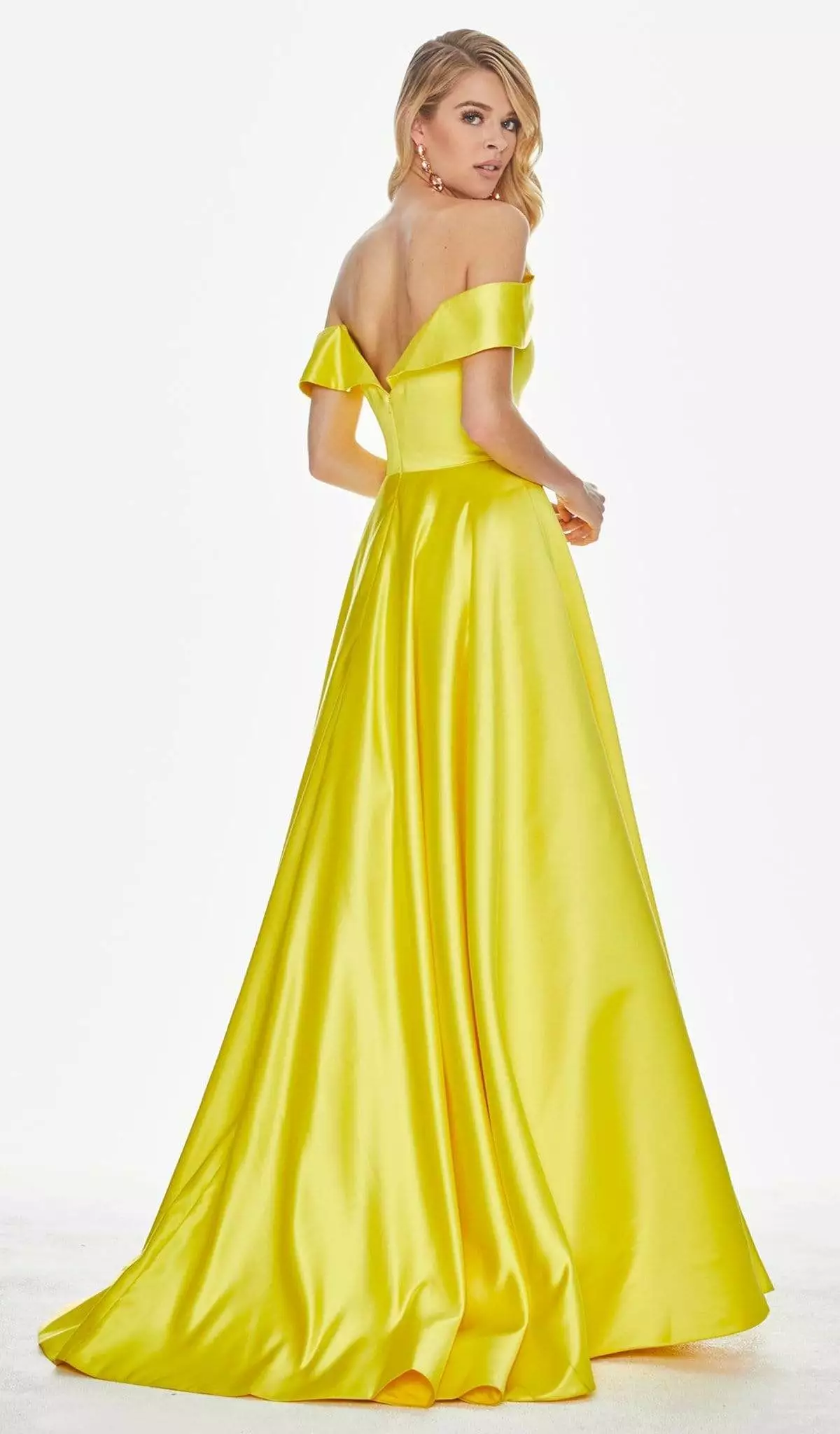 Reflect a stunning old red-carpet charm as you shimmer with luxurious flair in this Ashley Lauren 1399 creation. This full length vibrant satin stunner flaunts an off-shoulder neckline with plunging center cut covered with sheer mesh, draped sleeves and princess seam fitted bodice. The full A-line skirt vividly flourishes with fine pleats and finishes with a dramatic back sweep train. Pose pretty in front of the flashing lights of the cameras as you shine with poise in this Ashley Lauren masterpiece