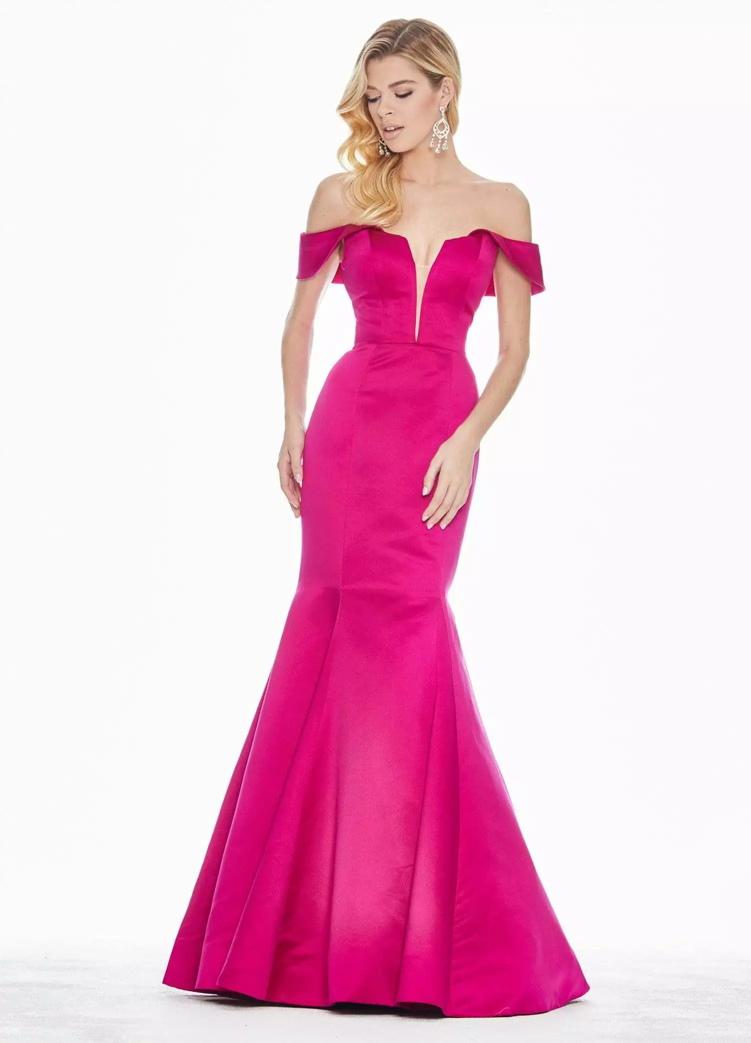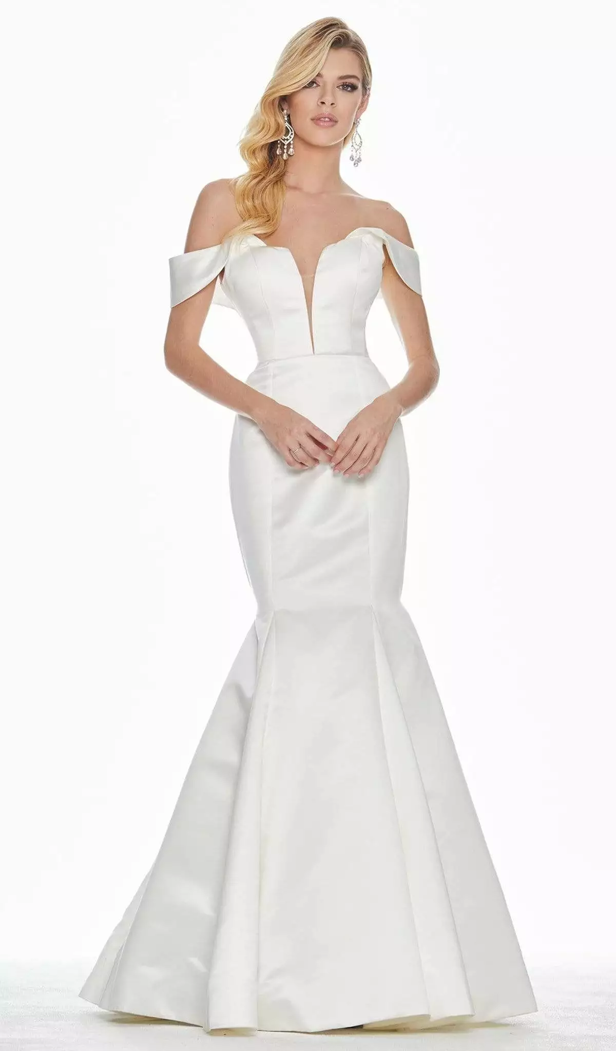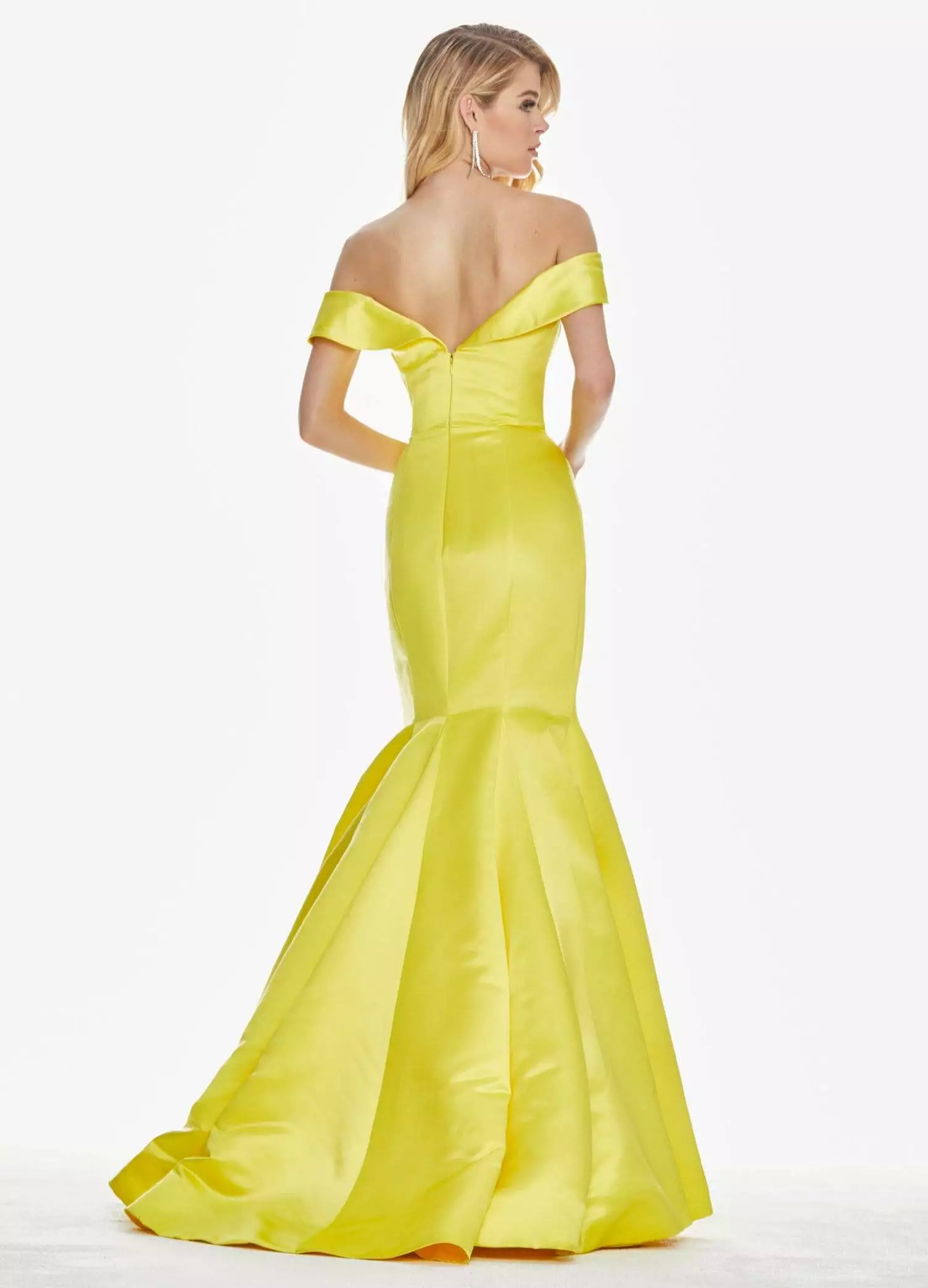 Knock them all out with your very presence in this gorgeously designed Ashley Lauren 1410 creation. Sculpted with seams on a luminous satin fabric, this chic piece shows a plunging off shoulder neckline with an illusion modesty inset. Beautifully folded as straps drape the arms, this gorgeous piece shows a wide v-open back, the mermaid skirt skims down the hips and flares stunningly into a sweeping train. Glow with sophistication in this glamorous Ashley Lauren masterpiece.