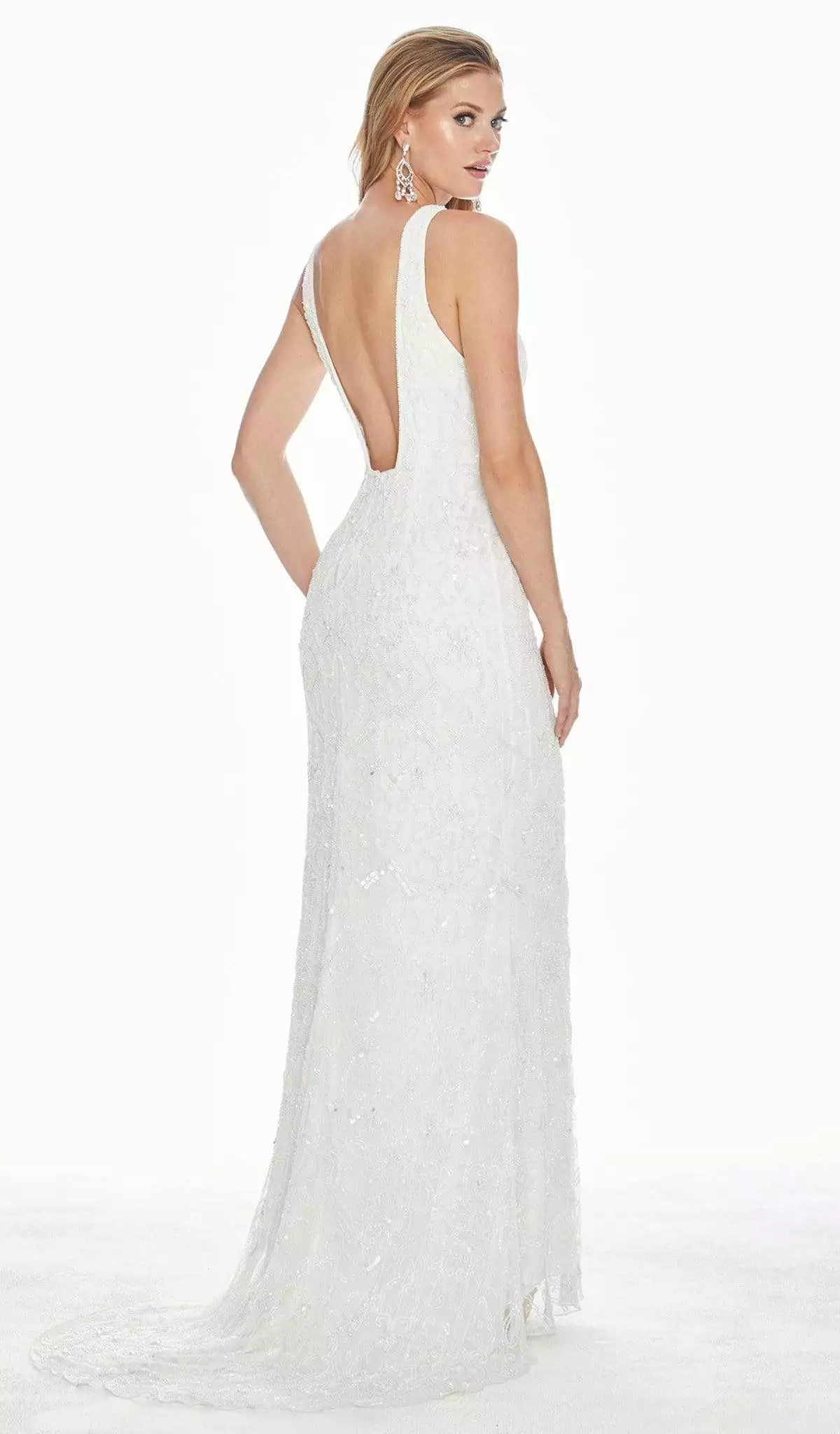 Look absolutely classy in this stunning evening gown by Ashley Lauren 1431. Hand beaded sequins adorn the whole ensemble for a shimmering effect. The fitted bodice features an illusion jewel neckline and sheer plunging V panel complemented with an open back. This gown has a sheath silhouette that gorgeously cascades to the floor completed with a sweep train. Get noticed in this radiant Ashley Lauren piece.