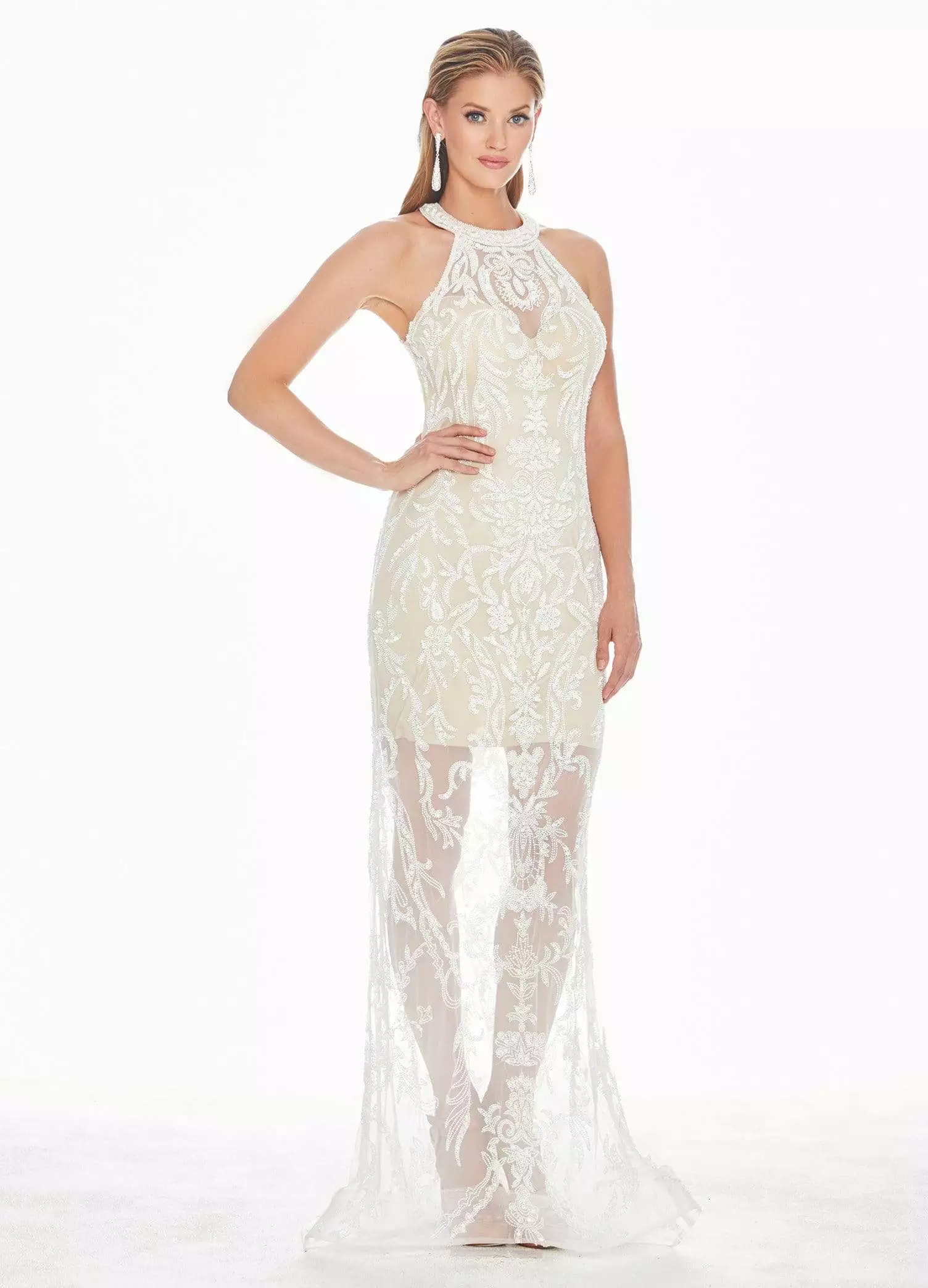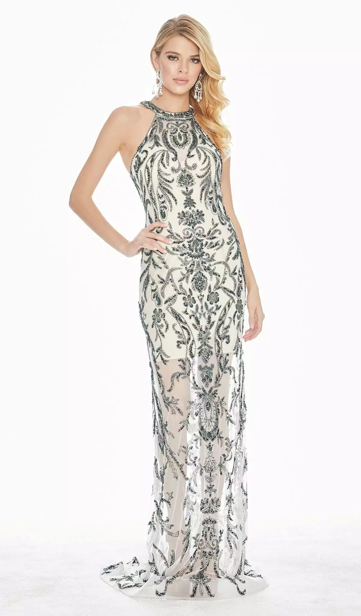 Turn heads instantly when you wear this beautiful Ashley Lauren 1441 evening gown. The fitted bodice features a beaded halter neckline complemented with an open back. The intricate beaded pattern designed throughout makes a modern statement as the sheath skirt is completed with a sweep train for added drama. This Ashley Lauren piece will definitely make you feel special!