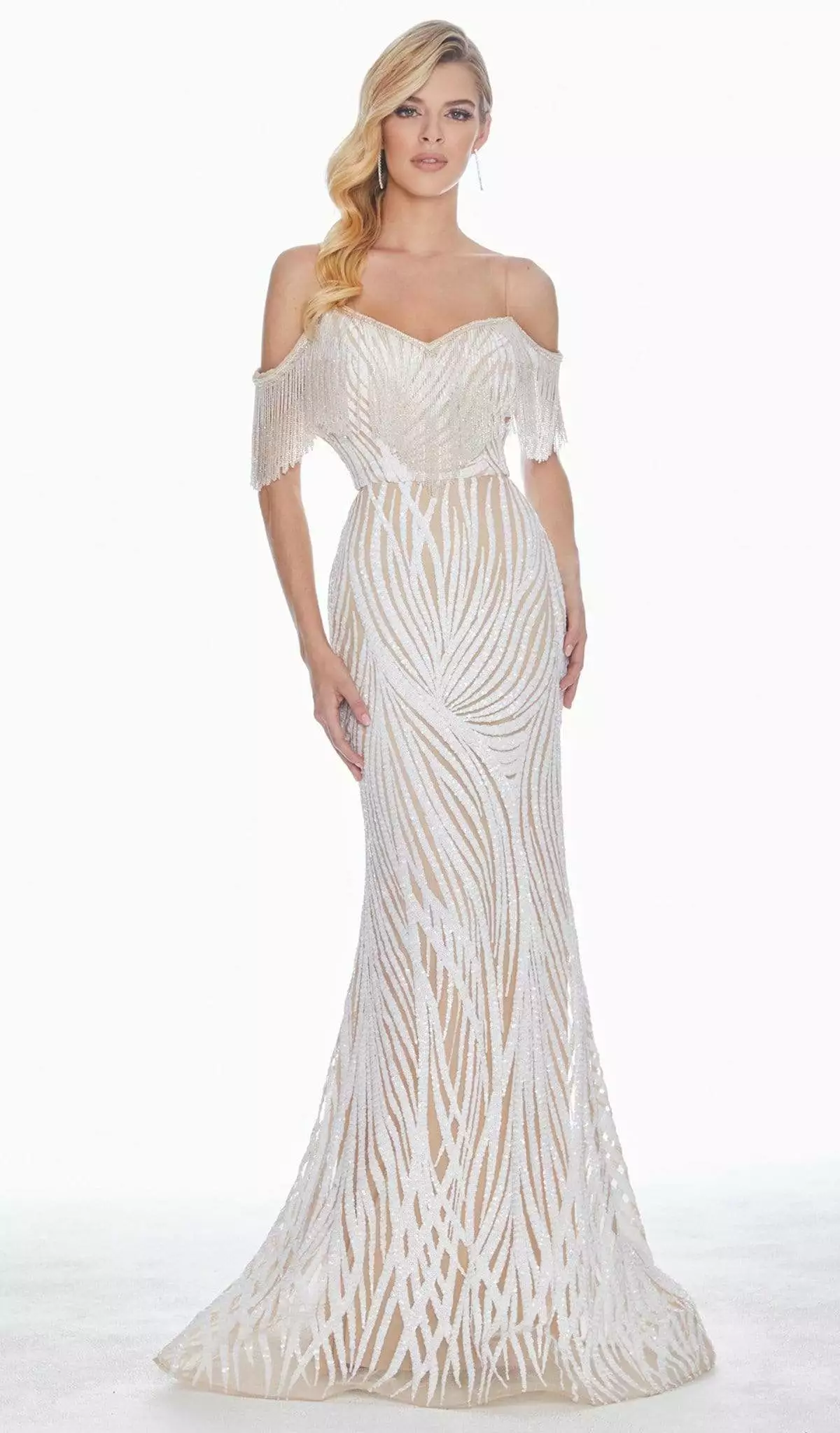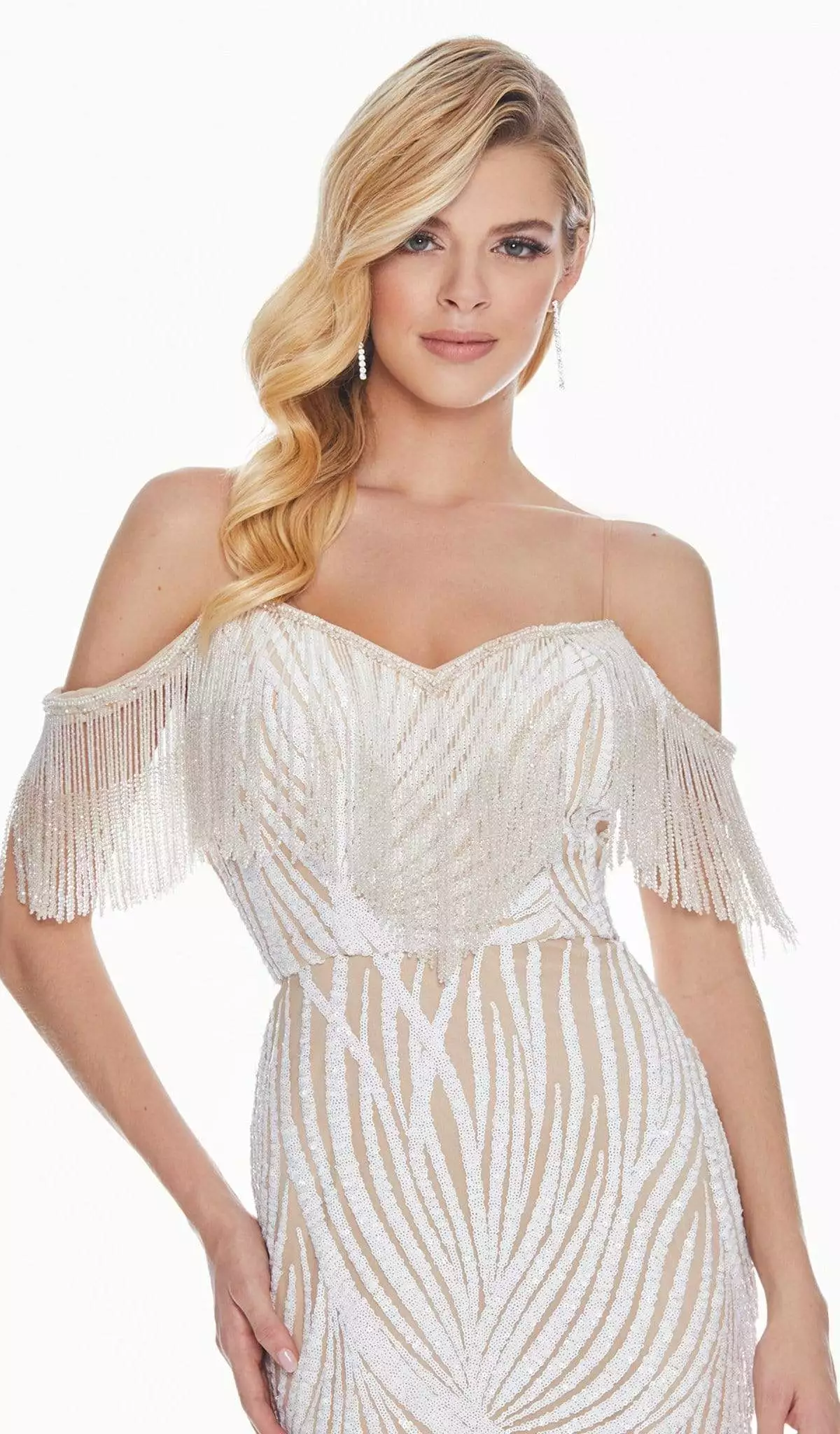 Create a perfect evening wearing this elegant dress by Ashley Lauren 1521. Charms in an off the shoulder neckline with beaded fringe details. The fitted bodice is decorated with sparkling sequins and cascade down the full length trumpet skirt. The dress flaunts an open back detail. Fall in love when you slip on this Ashley Lauren dress.