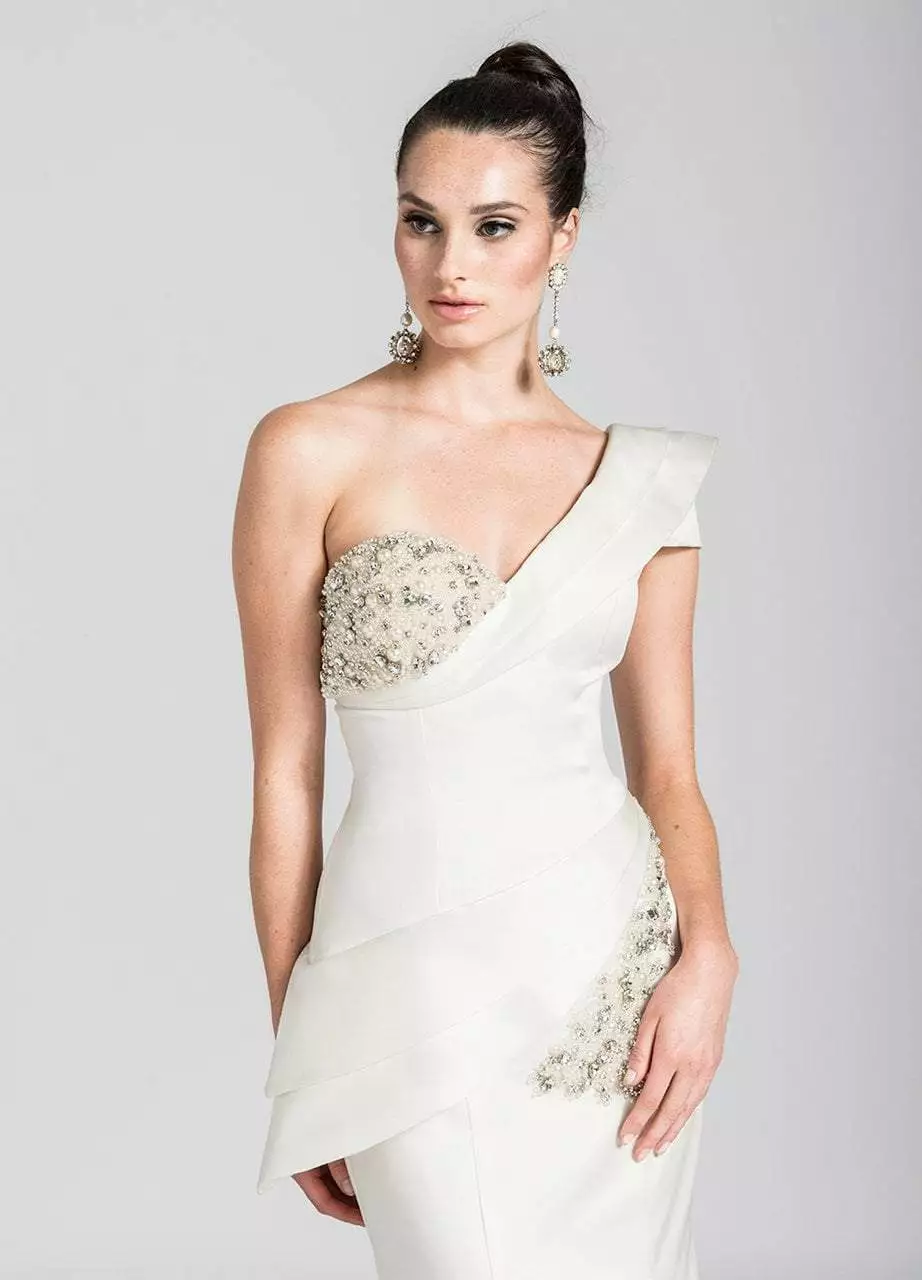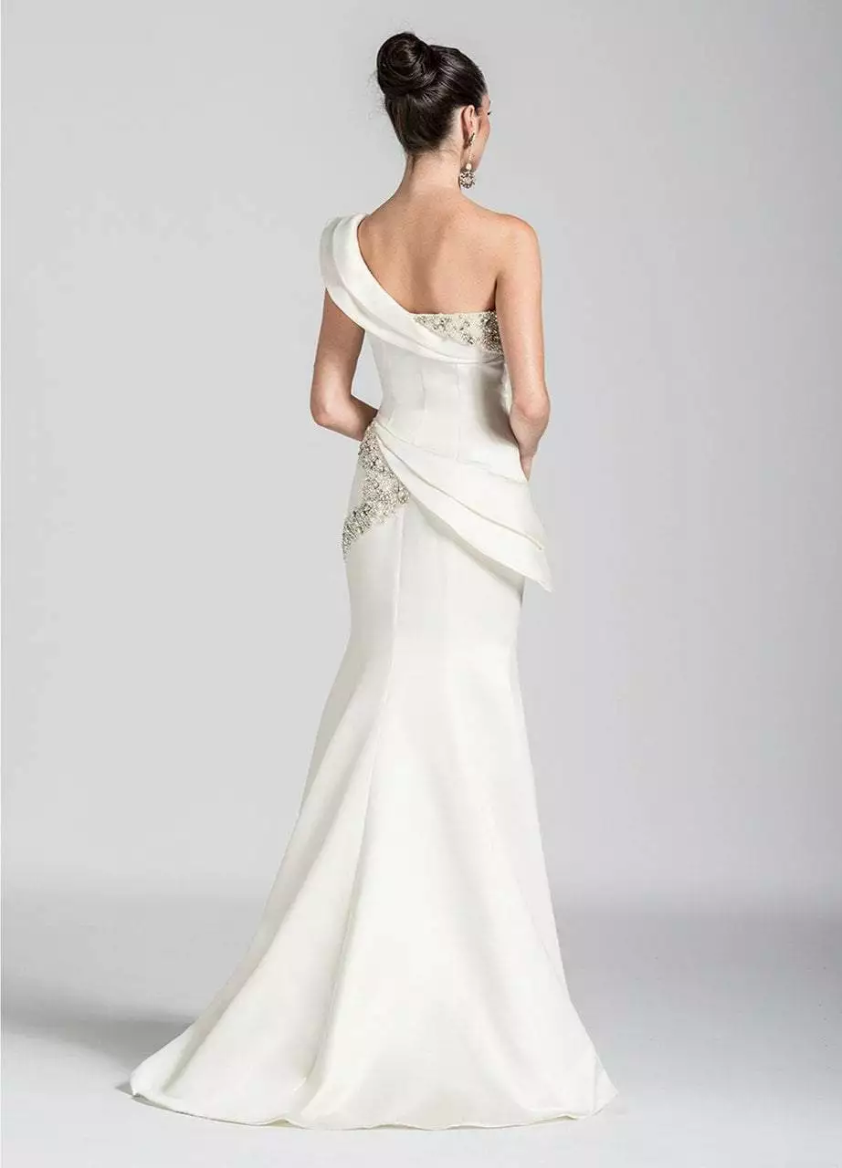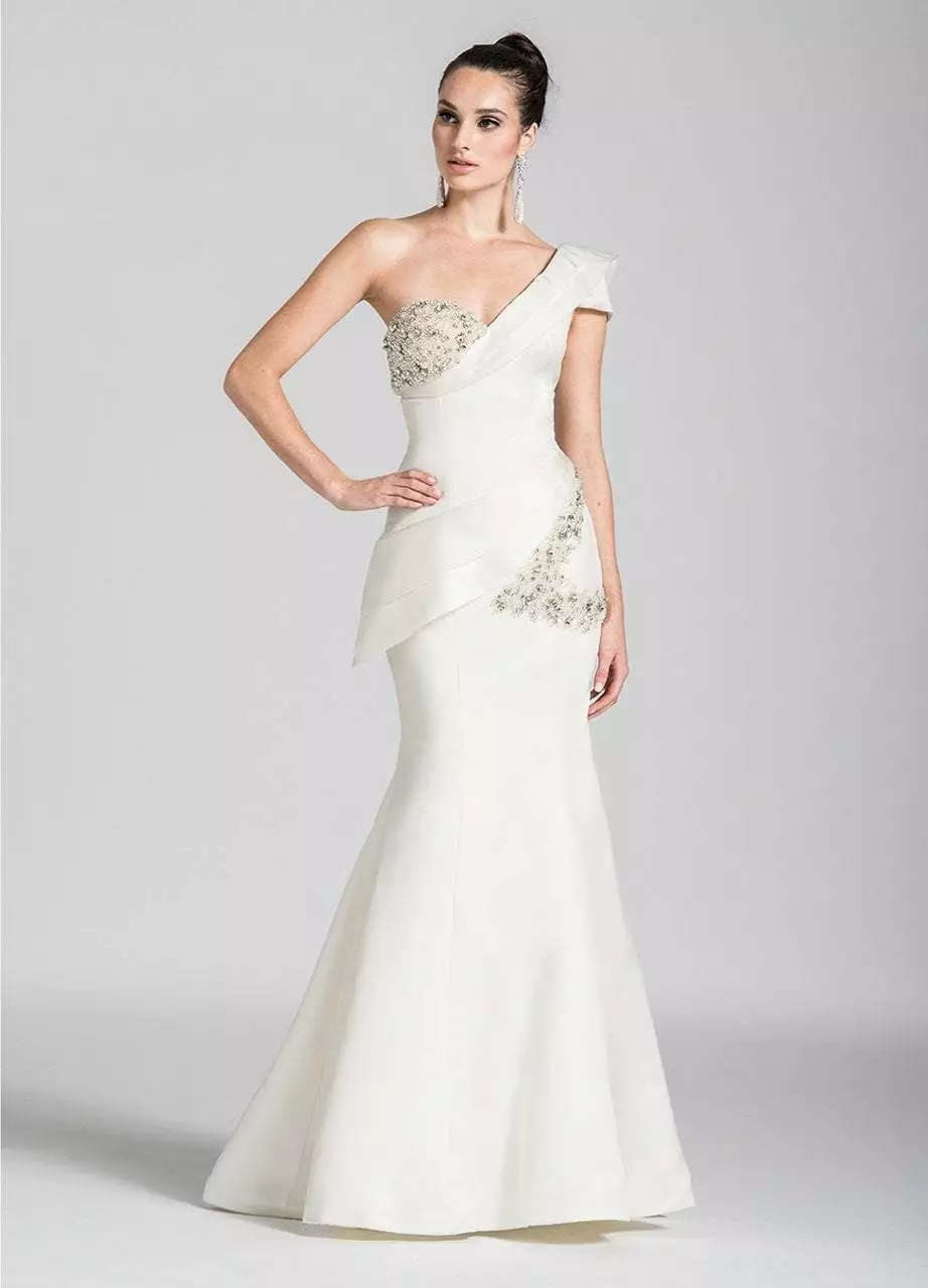 | Details: | One shoulder sleeve, Asymmetric bodice, Beading, Pleated layers, Mermaid skirt, Sweep train |