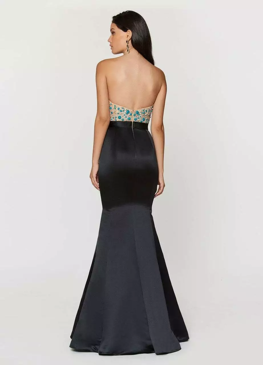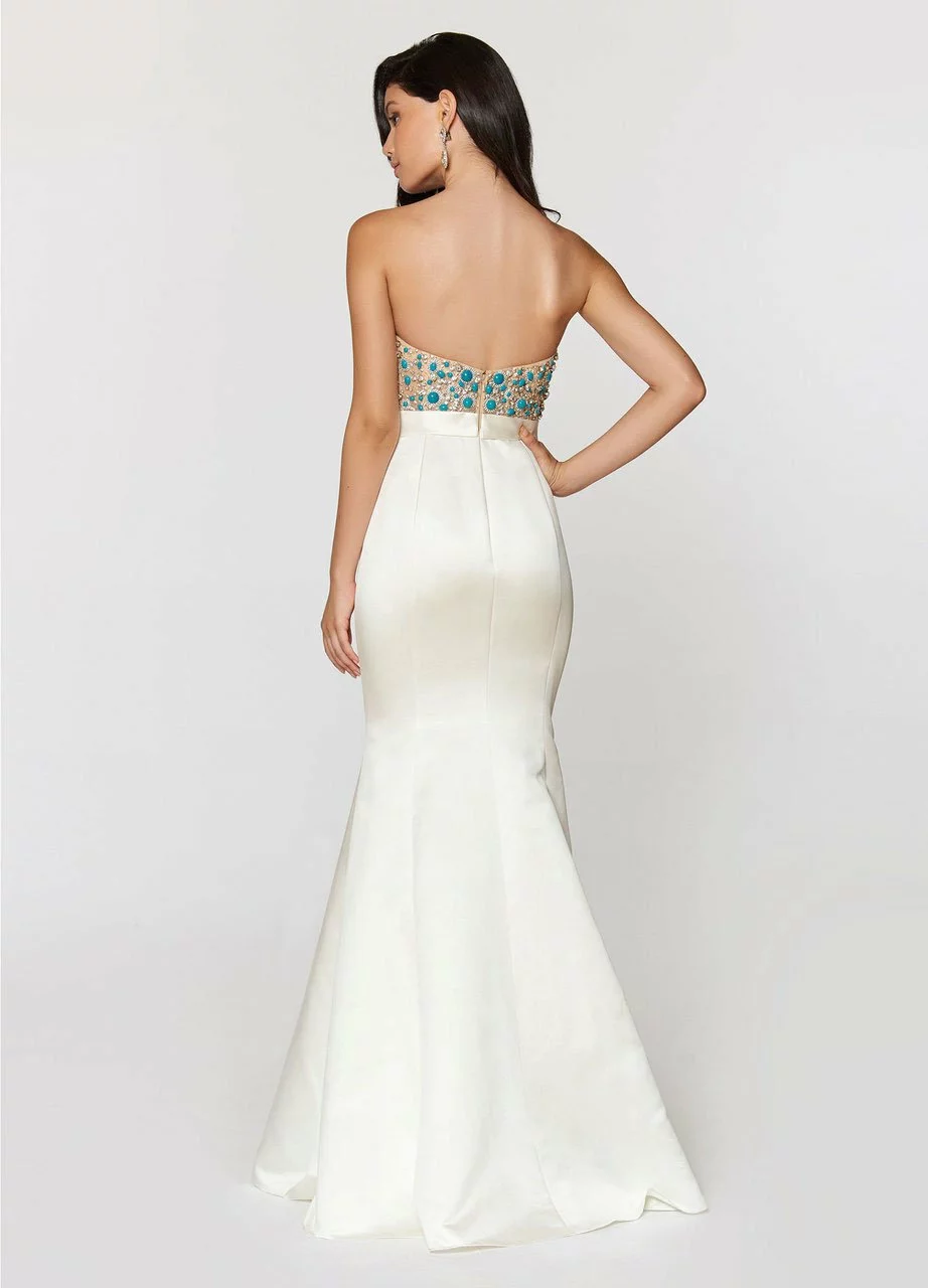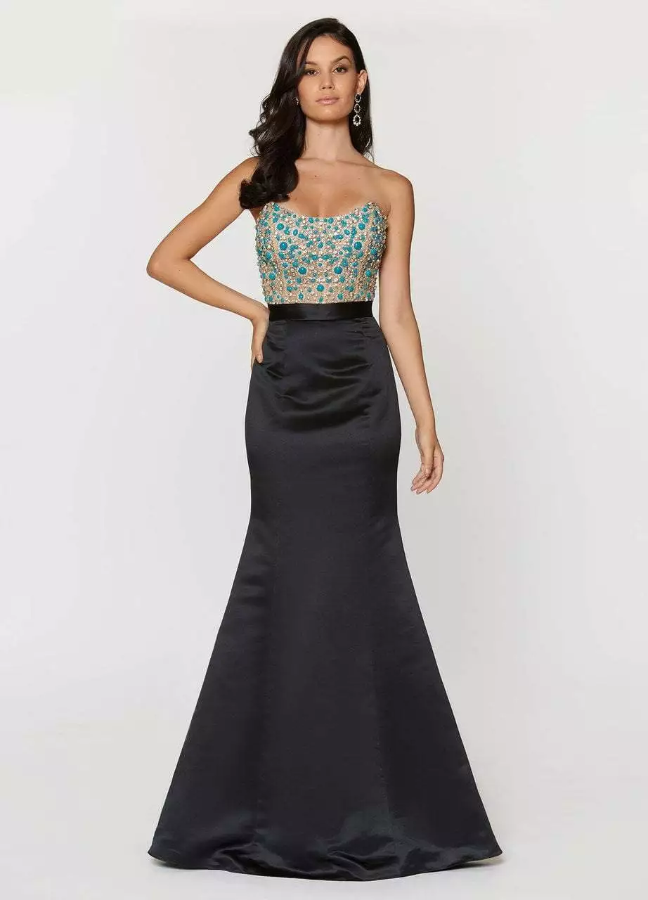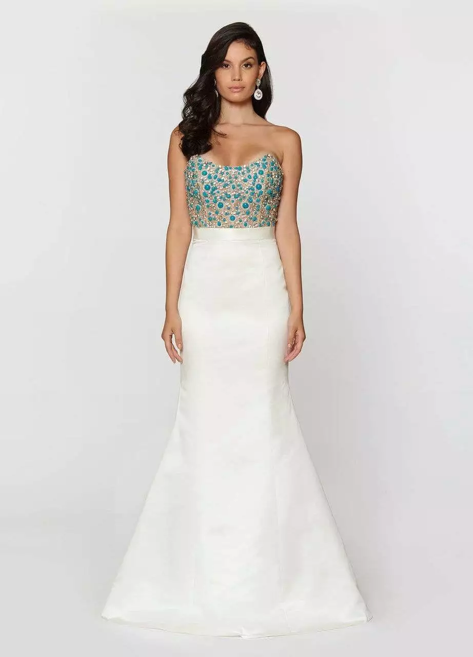 | Details: | Strapless, Corset Bustier, Illusion Bodice, Turquoise Beads, Crystals, Slender Waistband, Low Open Back, Back Zipper Closure, Full Length Hem |