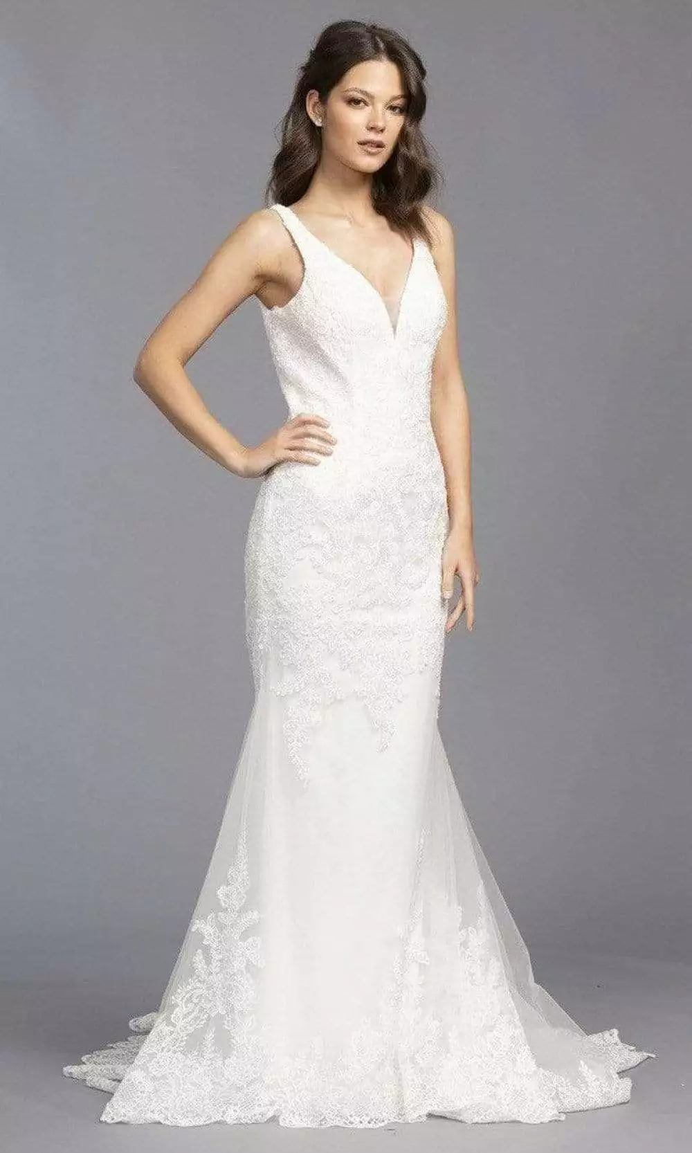 | Details: | Sleeveless, Plunging neckline, Embroidery, Fitted bodice, Bridal, V back, Back zipper, Court train, Back zipper, Floor length, Sweep train |