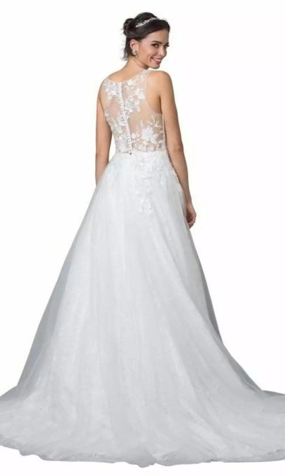 | Details: | Sleeveless, Lace, Beads, Illusion, Tulle, Back buttons, Floor length, Chapel train |
