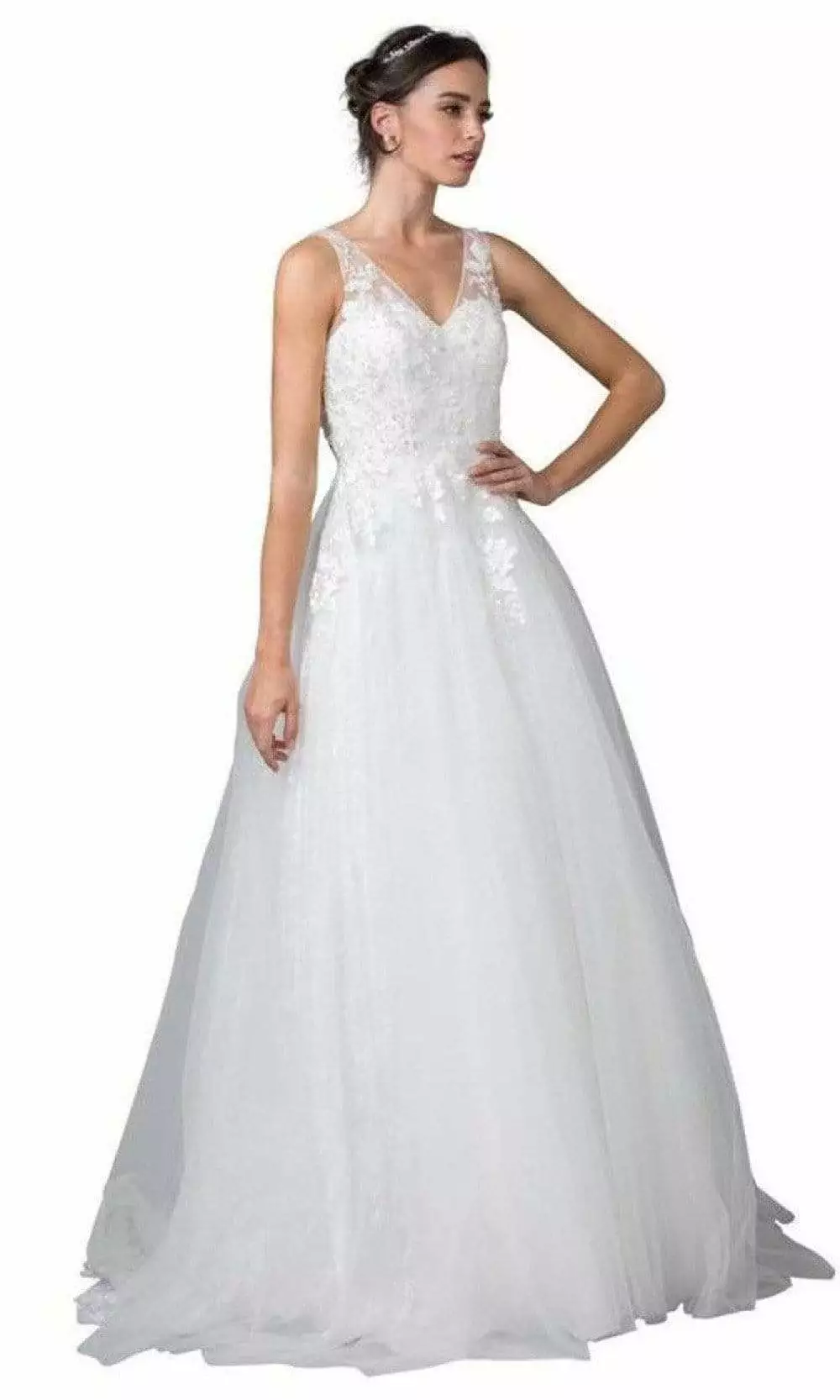 Earn your place in the limelight in this ahh-inspiring Aspeed Bridal L2355 gown. An amazing wedding dress that features a v-neck neckline and a sleeveless. It has an floral applique design on the top that drape onto the skirt. The dress is a sweep train and it is flowing gorgeously and elegantly to the ground. It has an illusion back with multiple buttons as a design that added to the sophistication of the gown. It has a back zipper for closure. This Aspeed Bridal dress is specially designed to make that special occasion worth reminiscing.