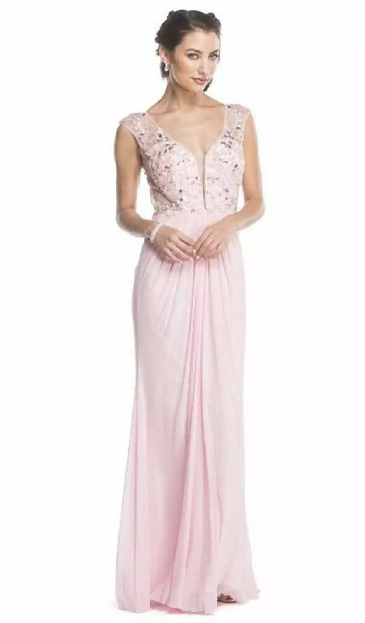You are sure to turn heads when you don this sexy Aspeed Design L1614 evening gown. The fitted bodice is beautifully beaded supported with sheer thick straps with cap sleeves. A sheer inset secures the front split of the plunging V neckline. The sheath skirt tapers to a full length hemline with sunning pleats. The back flaunts an open cut emphasizing one of your best assets. Walk in glamour and let all heads turn on you in this creation by Aspeed Design. Find more Pink Dresses.