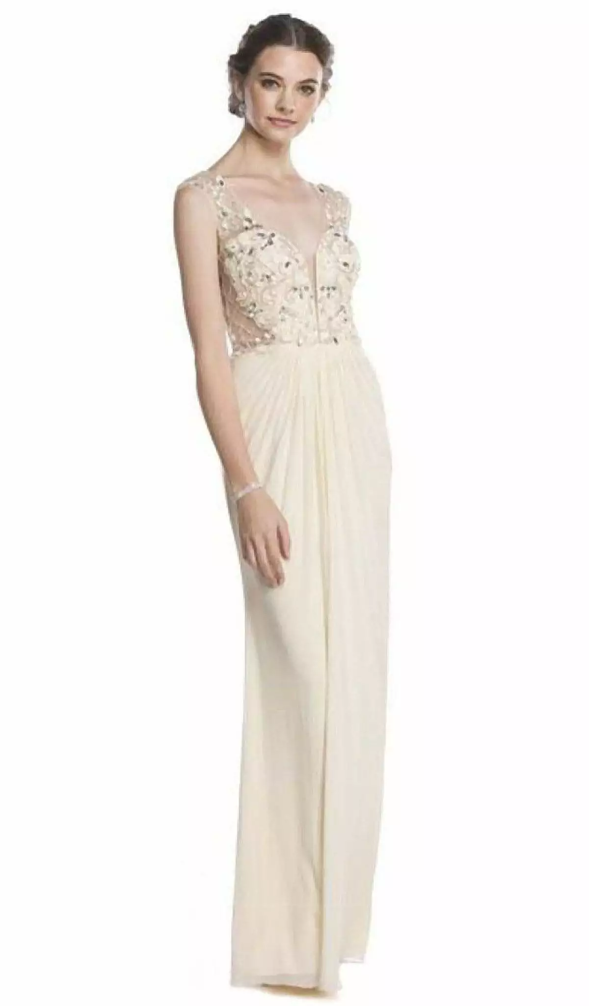 | Details: | Sheer Cap Sleeves, Inset Panel, Beaded Bodice, Pleated Skirt, Floor Length, Open Back |