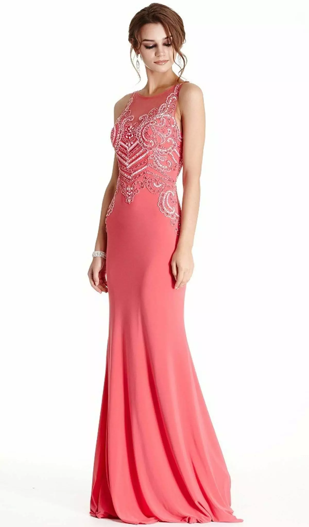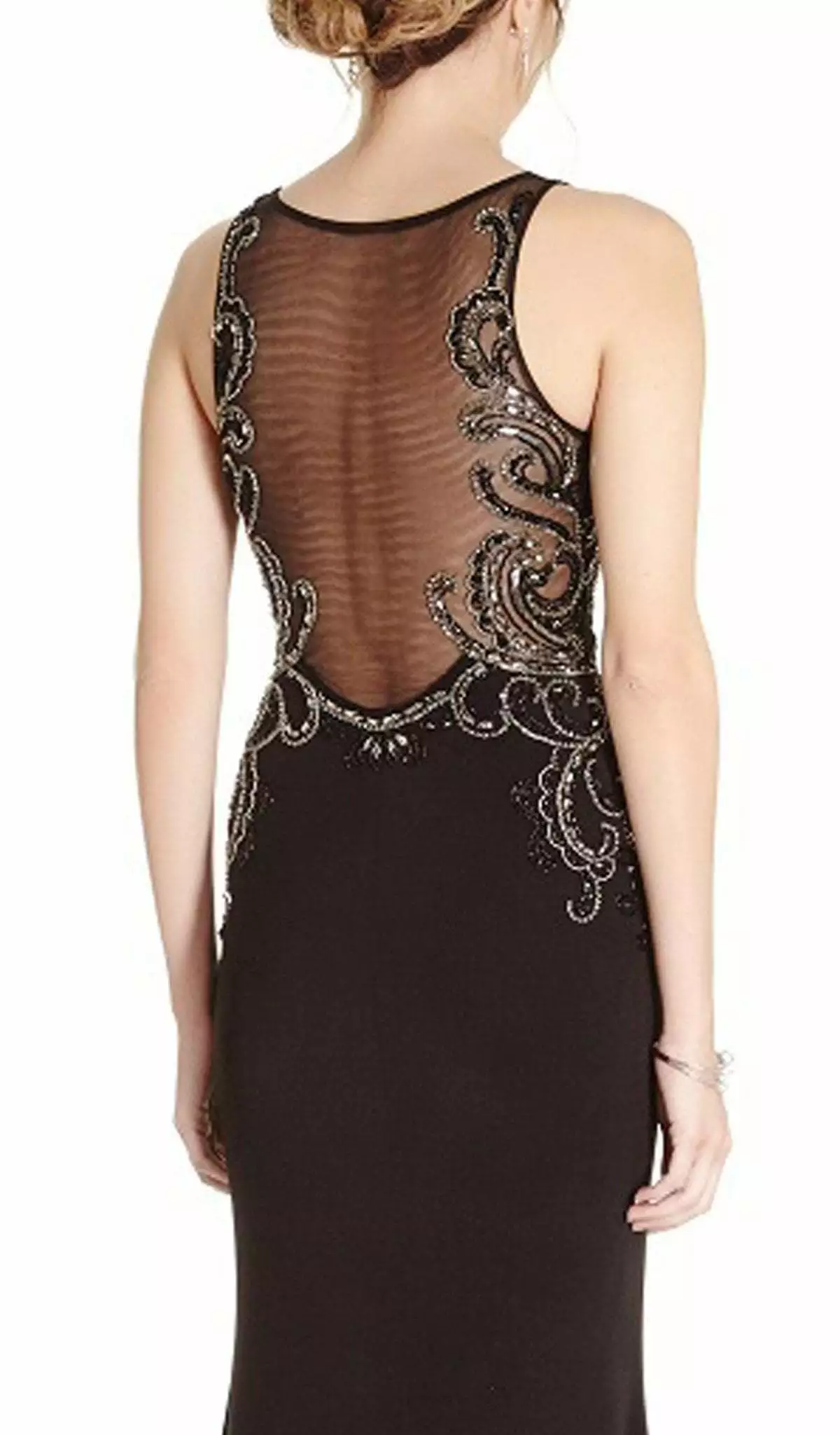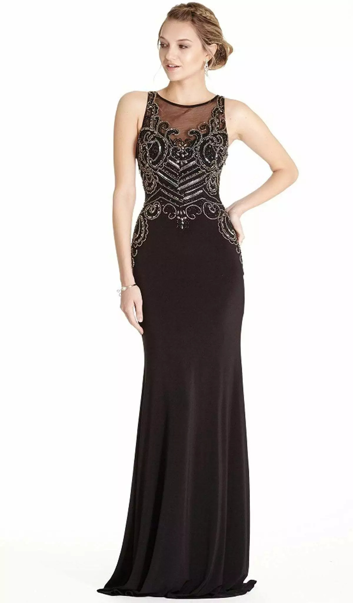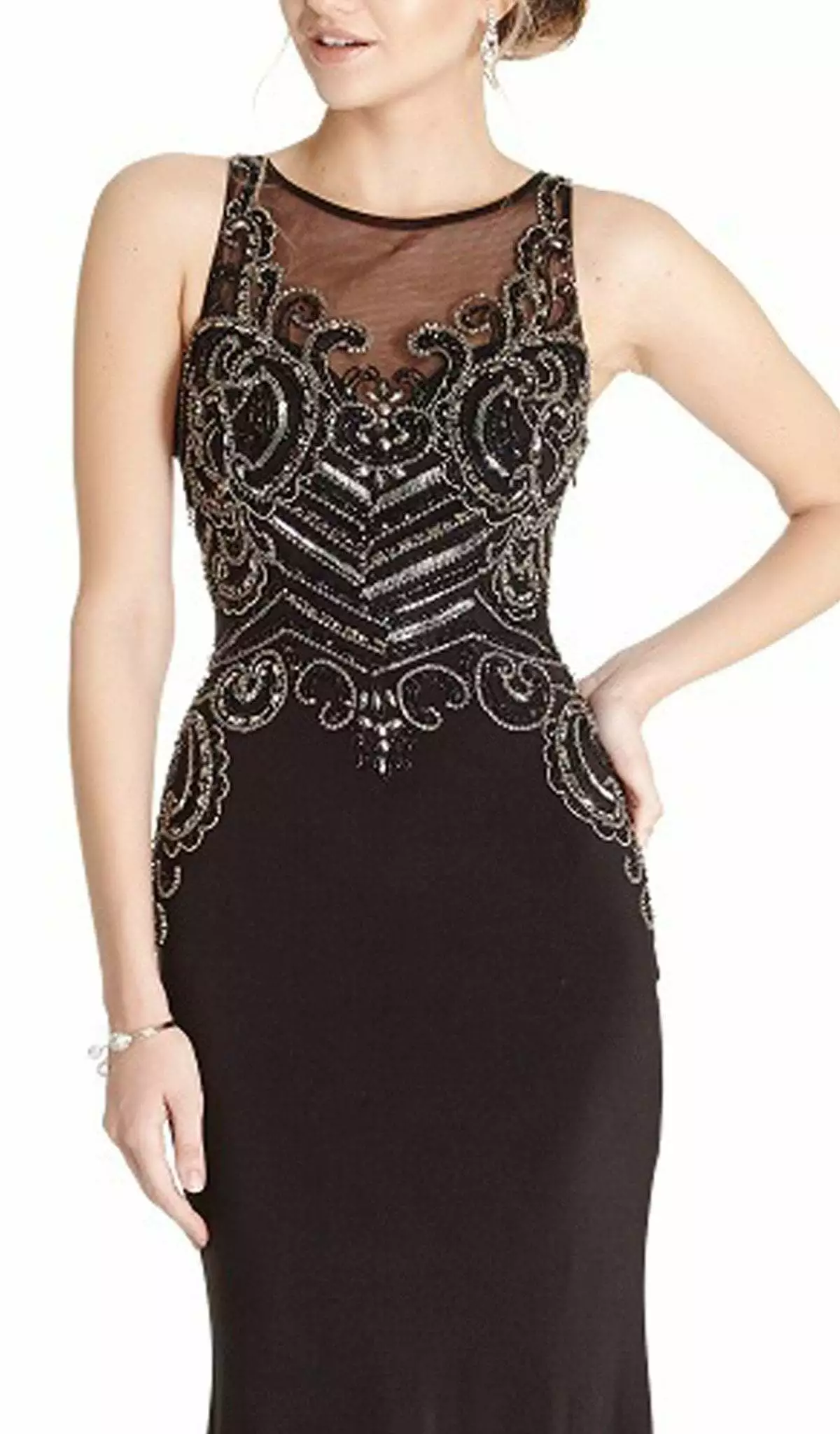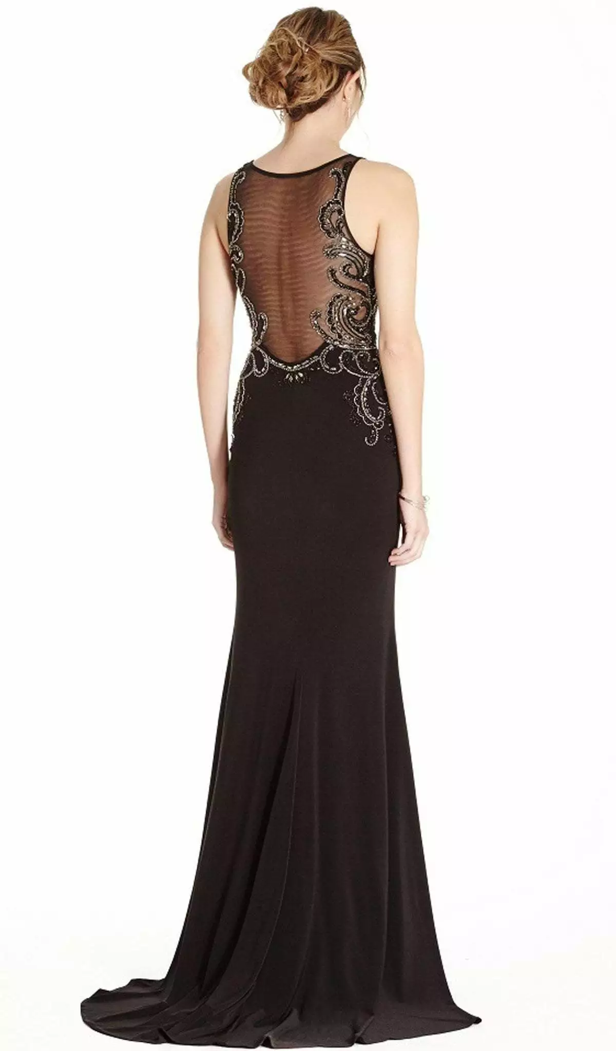 | Details: | Sleeveless, Sheer fabric, Embellishments, Fitted bodice, Sheath skirt, Sweep train |