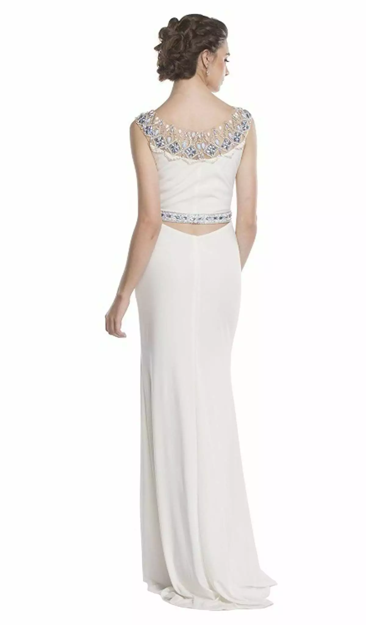 | Details: | Fitted, Embellished Neckline and Waist, Seamed Bodice, Floor Length, Side Slit, Back Zipper Closure, Back Cutout, Mini Train |
