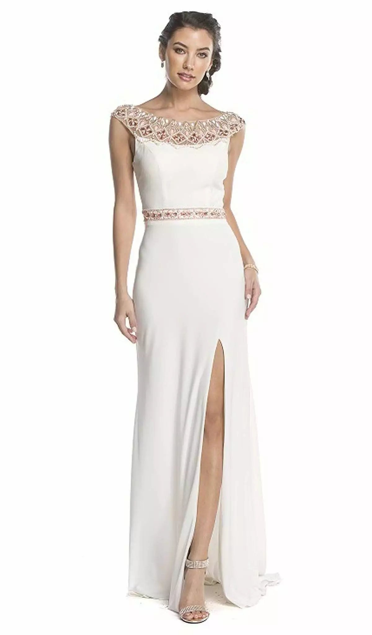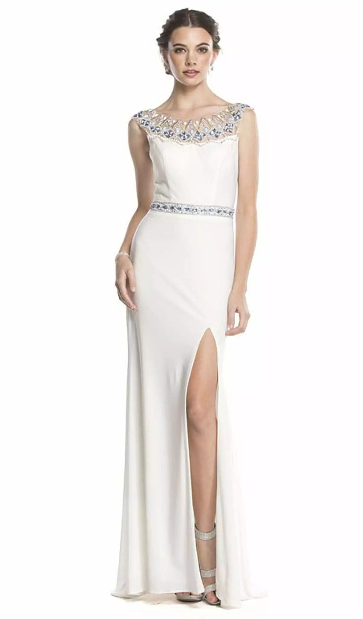 YouÂ’re oh so fashionable in a lovely evening gown from Aspeed Design L1606. Stunning embellishments adorn the illusion bateau neckline and waist for added glamour. A side slit accents the sheath skirt as it tapers to a full length hemline finished with a mini train. The back highlights a cutout detail with a center zipper closure that secures the ensemble. Turn heads instantly when you wear this Aspeed Design evening dress.