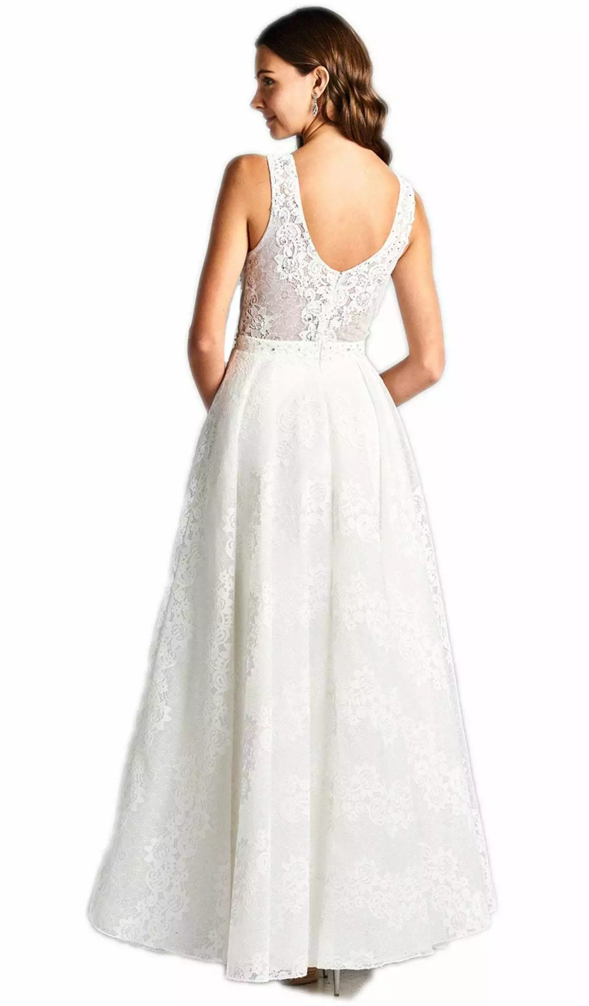 | Details: | Sleeveless, Plunging neckline, Sheer inset, Floral lace appliques, Rhinestone accents, Low scoop back, Back zipper, A-line skirt |