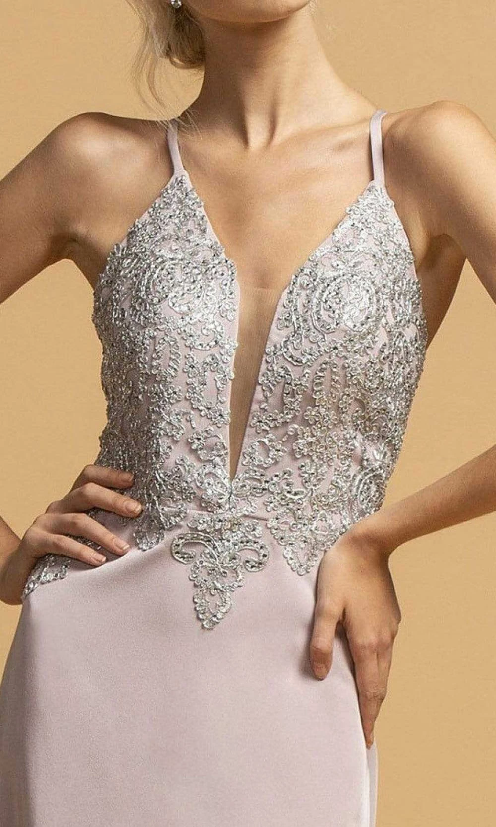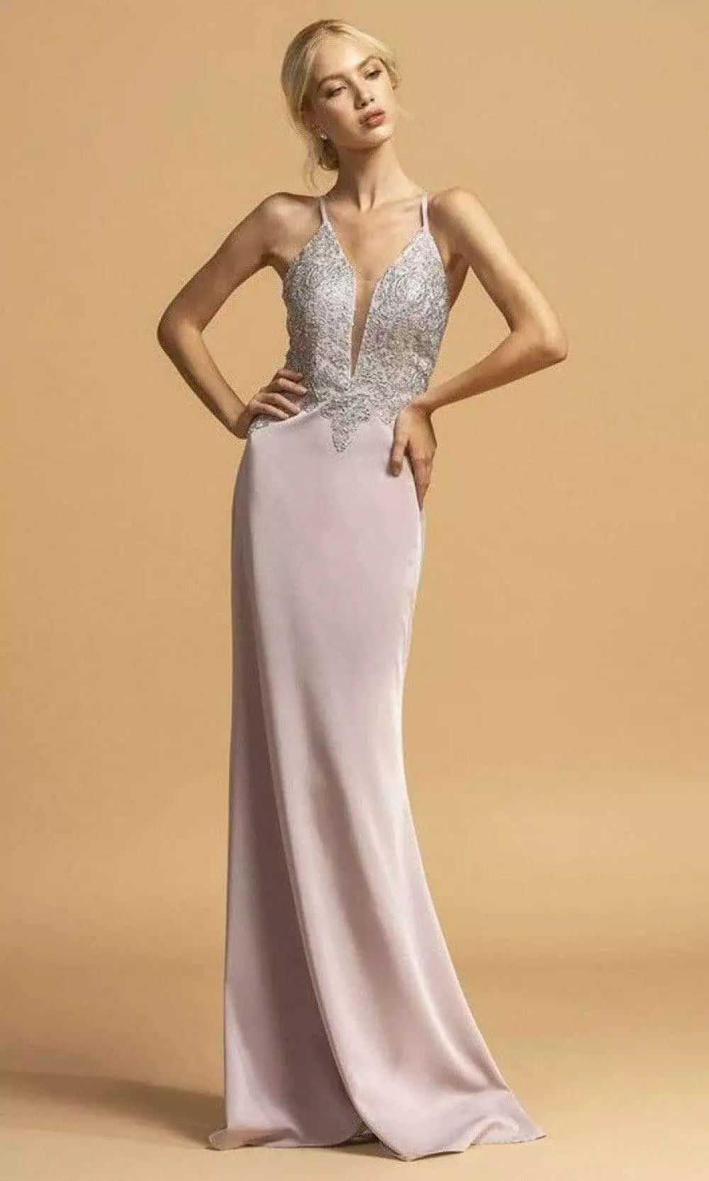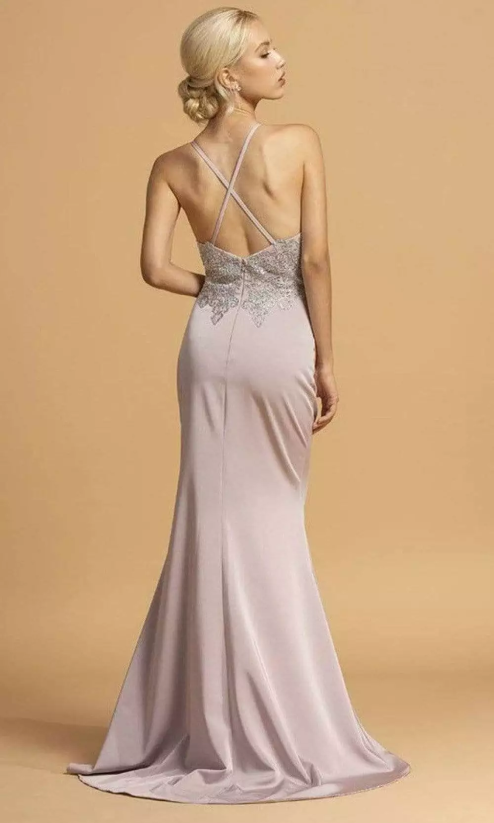 Orchestrate your moment to stand out in this Aspeed Design L2184 evening dress. This dress displays a plunging V-neckline supported by thin straps in an appliqued bodice. The skirt reveals a sheath silhouette while the back shows a cross back with back zipper closure. Perfect for prom, pageant, or a black tie event, this Aspeed Design creation surely is a great choice. Model is wearing Mauve color.