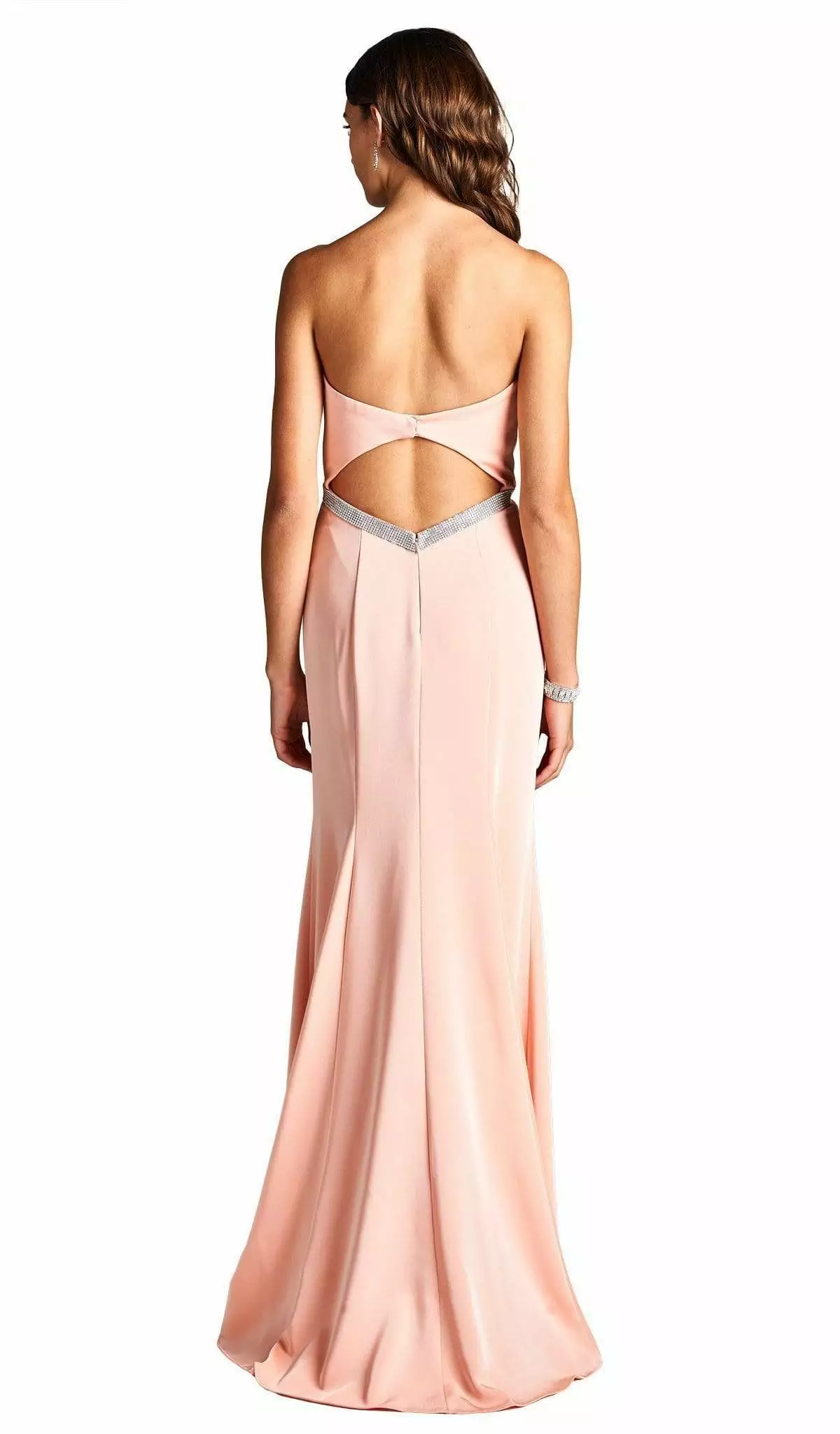 | Details: | Strapless, Plunging neckline, Sheer inset, Princess seams, Jeweled waistband, Sheath skirt, Mid- open back, Diamond cutout, Back zipper, Mini train |