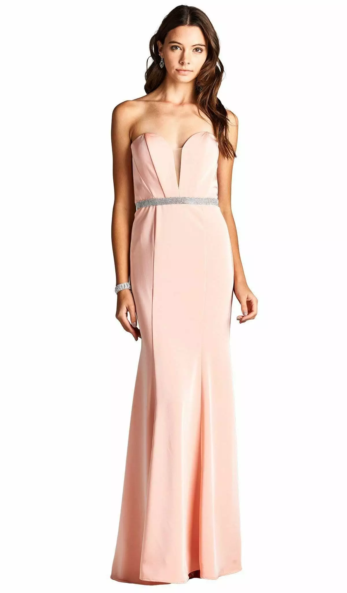 Capture the glamour as you walk on this gorgeous dress from Aspeed L1888. This alluring dress features a strapless, plunging sweetheart neckline with sheer inset at midbust. Accenting the bodice are princess seams and a sexy diamond back cutout. The dress has a zipper closure while the waist is wrapped in an embellished band. From the waist begins a full length sheath skirt with a mini train finish. Be ready to capture the spirit of that romantic evening in this Aspeed dress. Model is wearing Blush color.