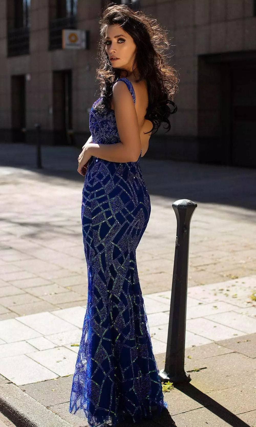Flaunt your best assets in a scintillating gown from Chic and Holland AN1449. Embellished with beadwork and sequins rendered in a geometric spectacle, this sleeveless gown showcases a plunging V neckline with wide shoulder straps. The back flaunts a low open cut and the sheath skirt flows magnificently down to the floor. This Chic and Holland masterpiece will make sure you turn heads all night long. Buy the trendiest and chicest Chic and Holland Haute Couture evening gowns, luxury evening dresses, chic Couture prom dresses, Haute Couture cocktail dresses and Haute Couture evening dresses to make a grand entry at special events. Model is wearing the Navy color.