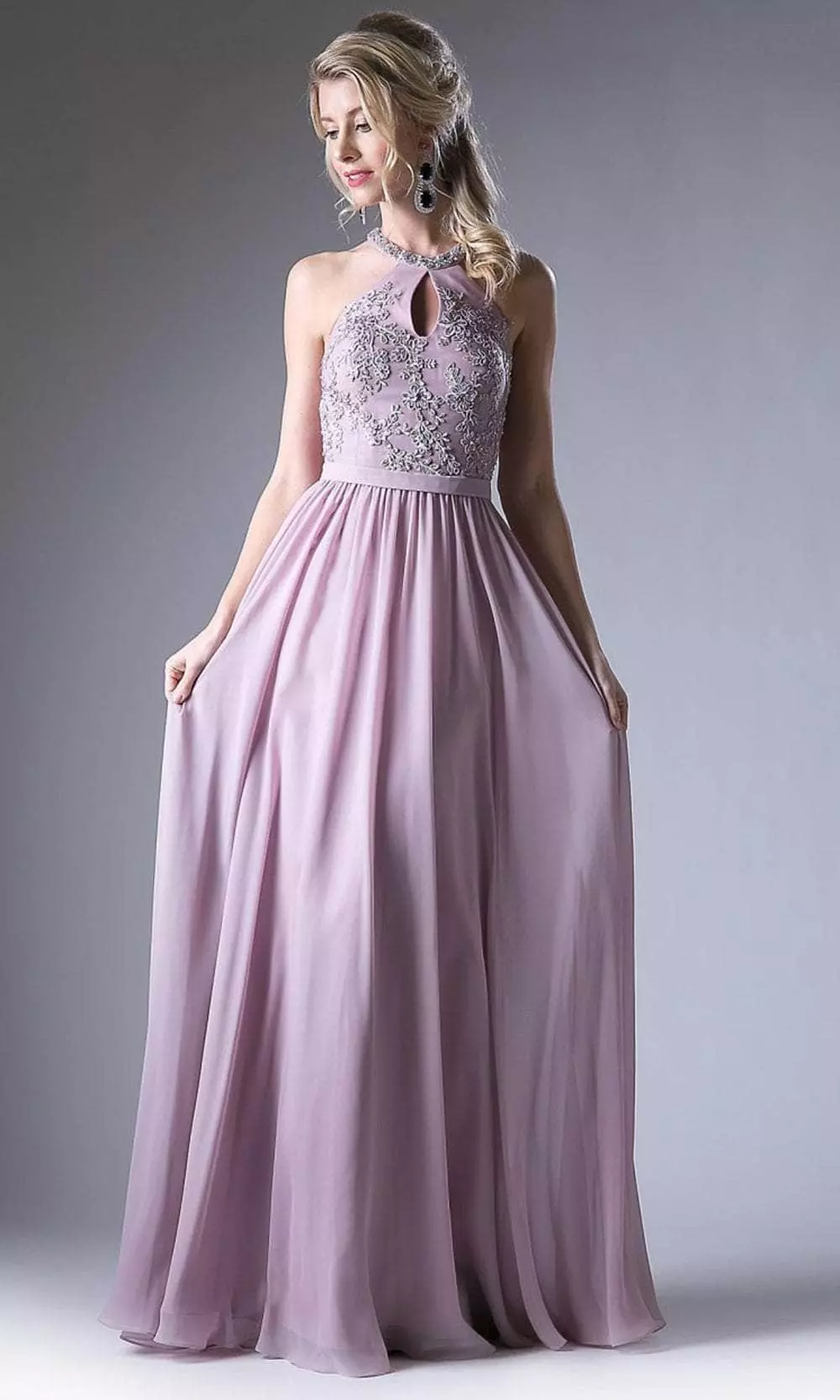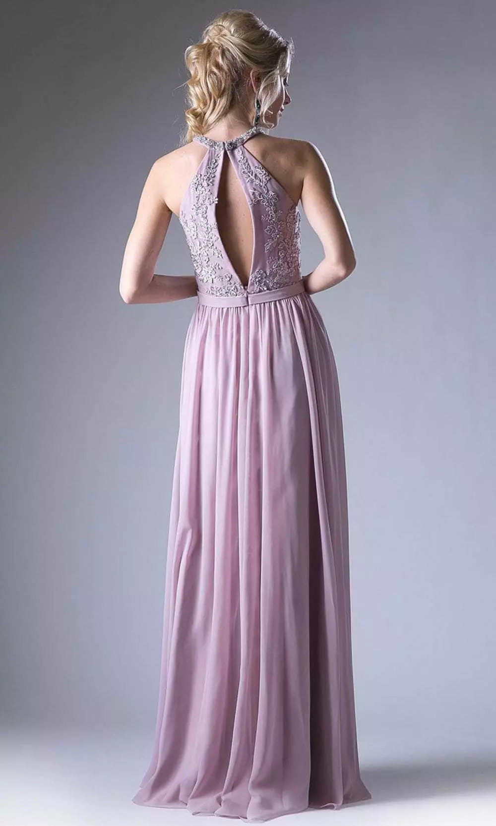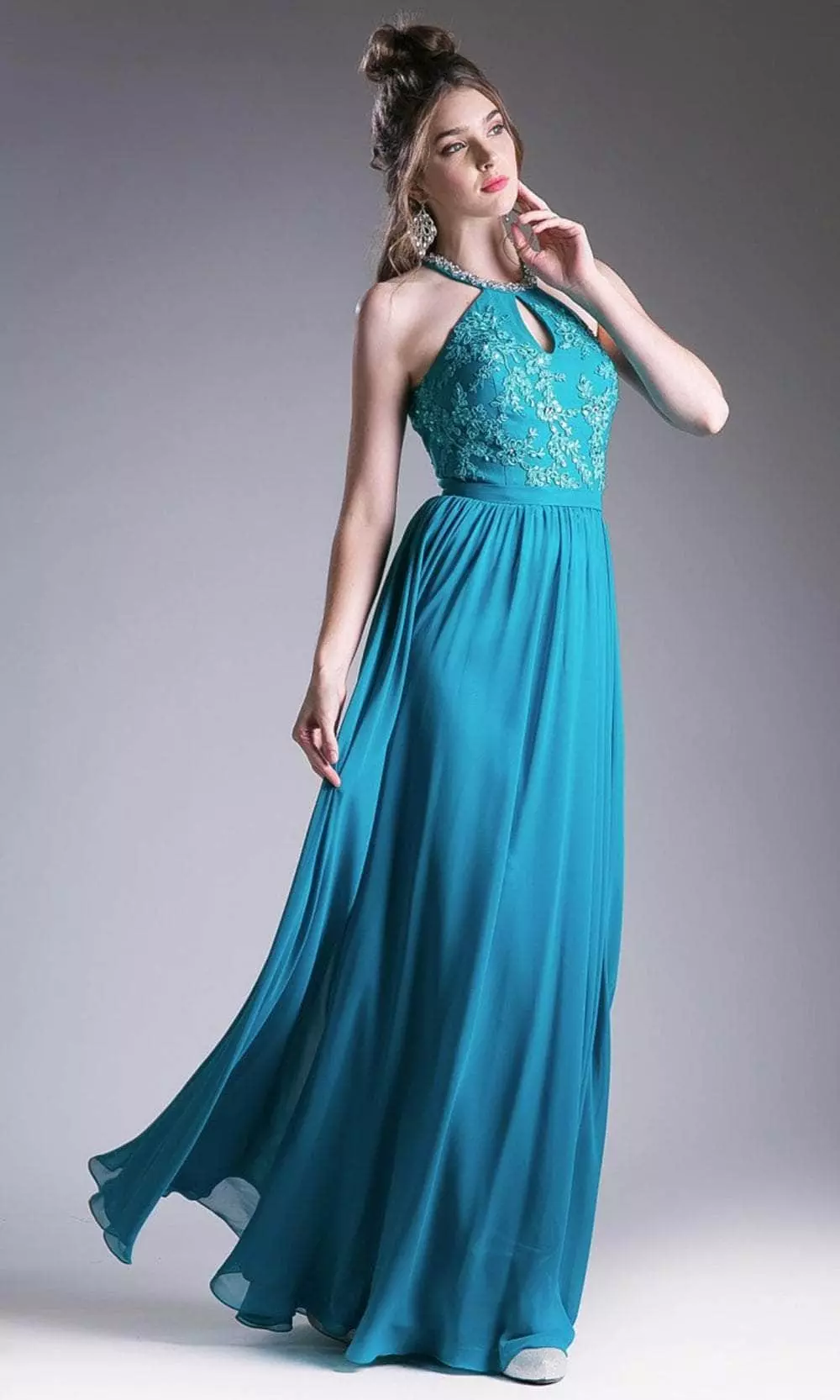 Expect to be turning heads as you walk into your special event wearing this creatively romantic dress by Cinderella Divine 1006. A so beautiful and elegant simple dress is ready for you. Featuring halter neckline with mini keyhole front is very sophisticated that matches perfectly with the mini floral embroideries on the body. Back has large cut out and closes with a zipper in the middle. Skirt is flowy as it uses luxurious chiffon fabric and reaches floor length with a sweep train. Create magical moments as you revel in Cinderella Divine. Models are wearing the Rose and Teal colors.