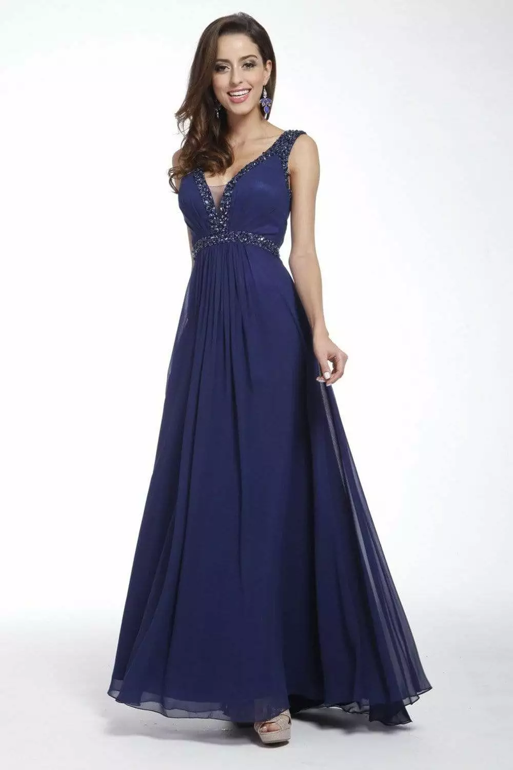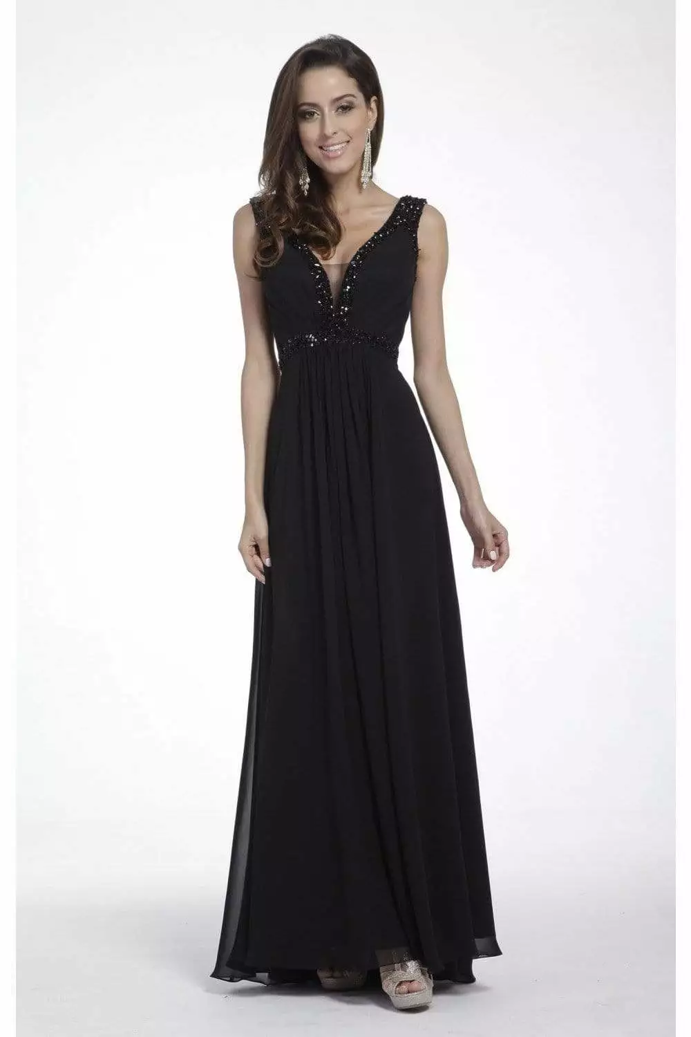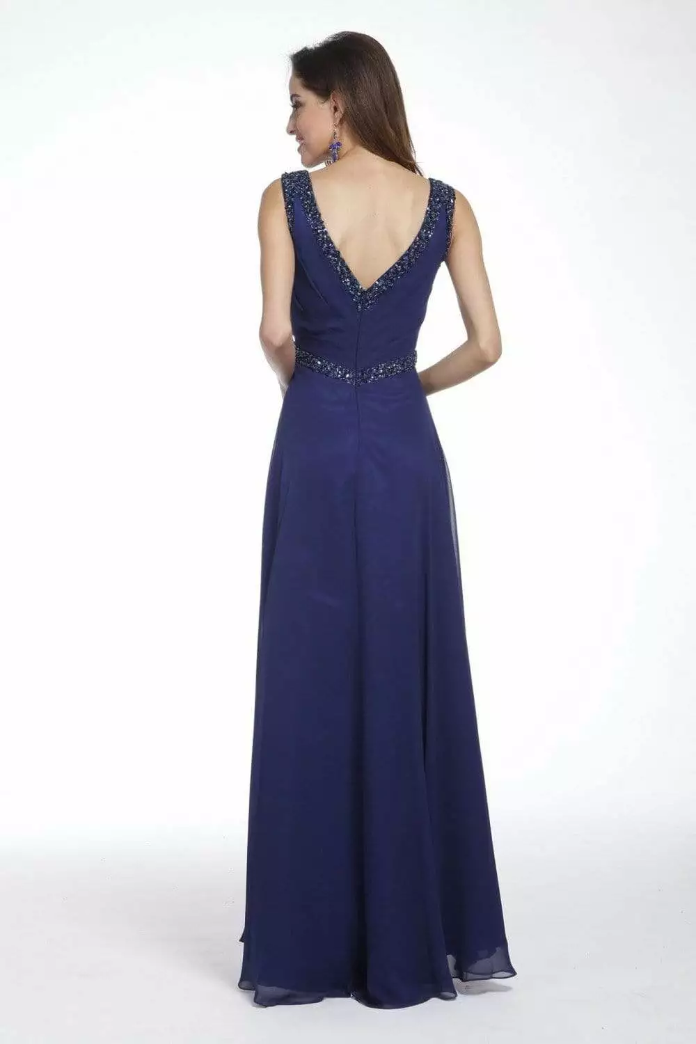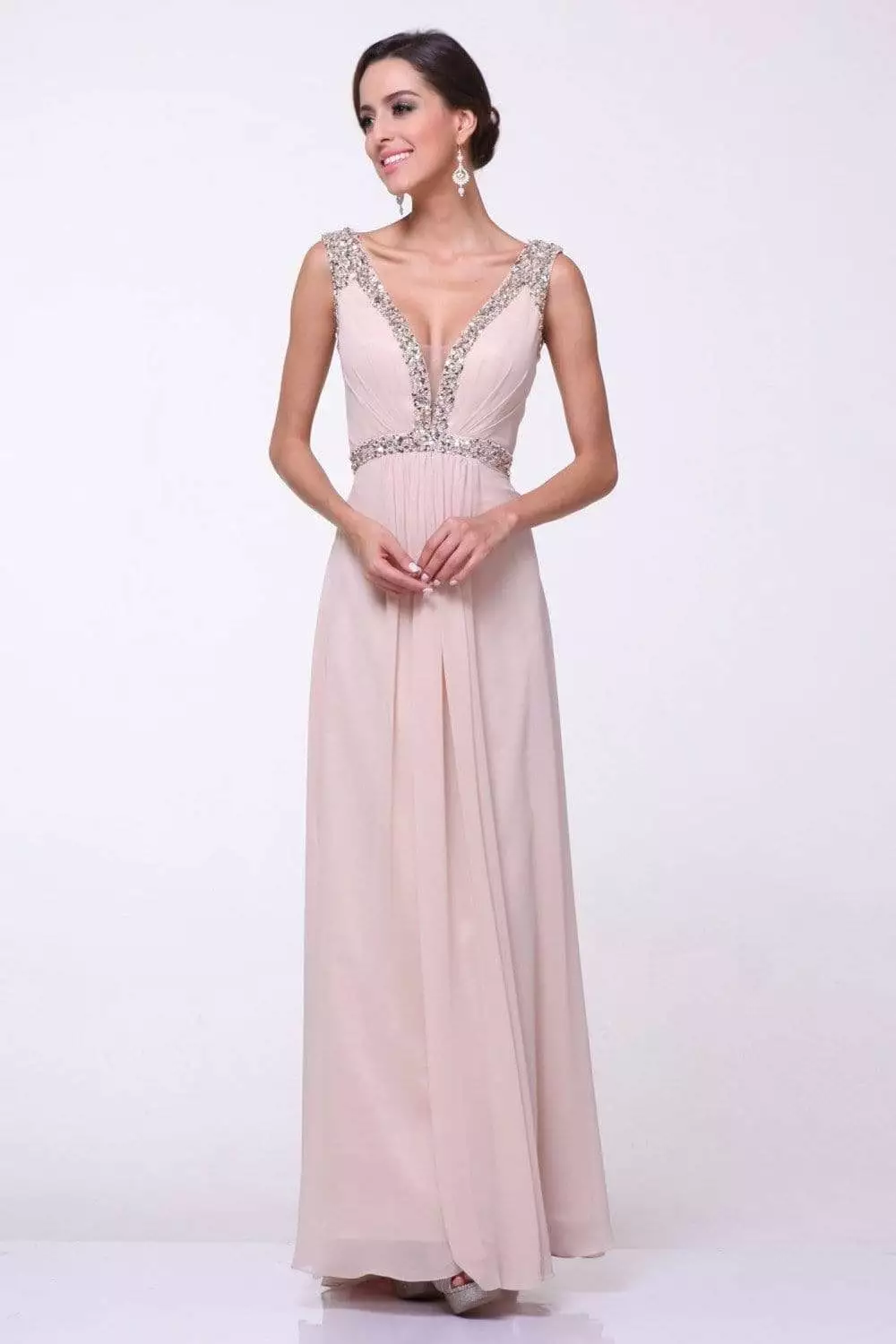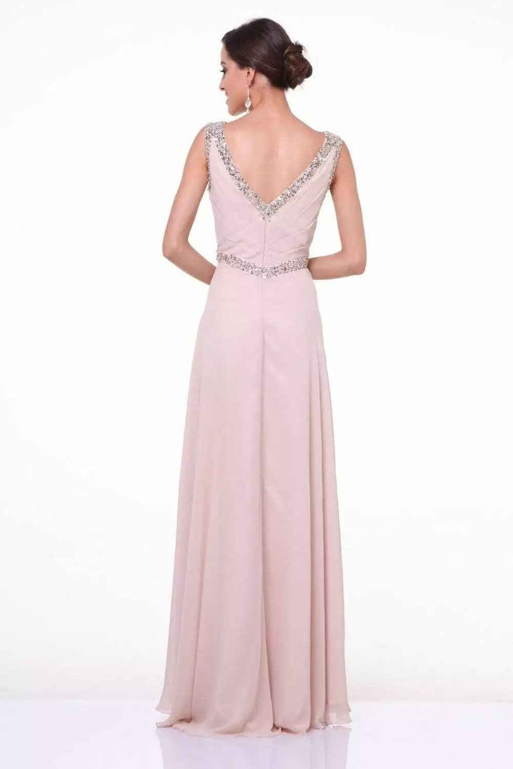 Walk in glamour and let all heads turn on you in this long formal dress by Cinderella Divine 958. A plunging V-cut neckline offers you a sexy touch to this full-length chiffon gown. The sleeveless bodice is decked with glittering beaded accents that trims the shoulders, neckline and the waist and forms the V shape at the back. The flowy skirt draping in a full A-line silhouette gives the dress a classy finish. Look stunningly amazing at your special event with this Cinderella Divine dress.