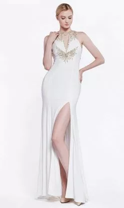 Lavish in the mesmerizing intensity of this Cinderella Divine Bridal 60547 creation. Embellished with a starburst of beadwork accenting the sleeveless bodice, this dress features a halter neckline and an accompanying cutout accent. Trimmed with glistening adornments framing the deep cutout back, the sheath skirt is designed with a high slit as it trails into a flowing sweep of train. Glow with pure elegance in this Cinderella Divine masterpiece.