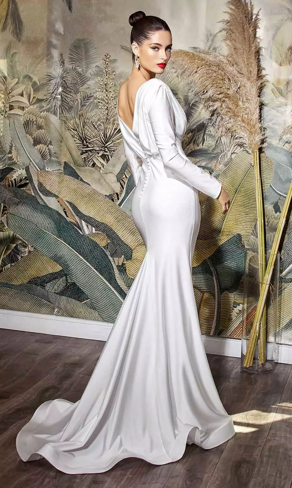 Impress everyone with the sophistication of this Cinderella Divine Bridal CD0169 creation on your wedding day. Defined with draping accenting the bodice, this gown features a plunging v-neckline with an empire design. The v-open back has a cowl accent and fabric buttons. The long sleeve piece shows a mermaid skirt as it touches the floor with a train. Flourish a romantic flair as you walk down the aisle in this Cinderella Divine masterpiece.
