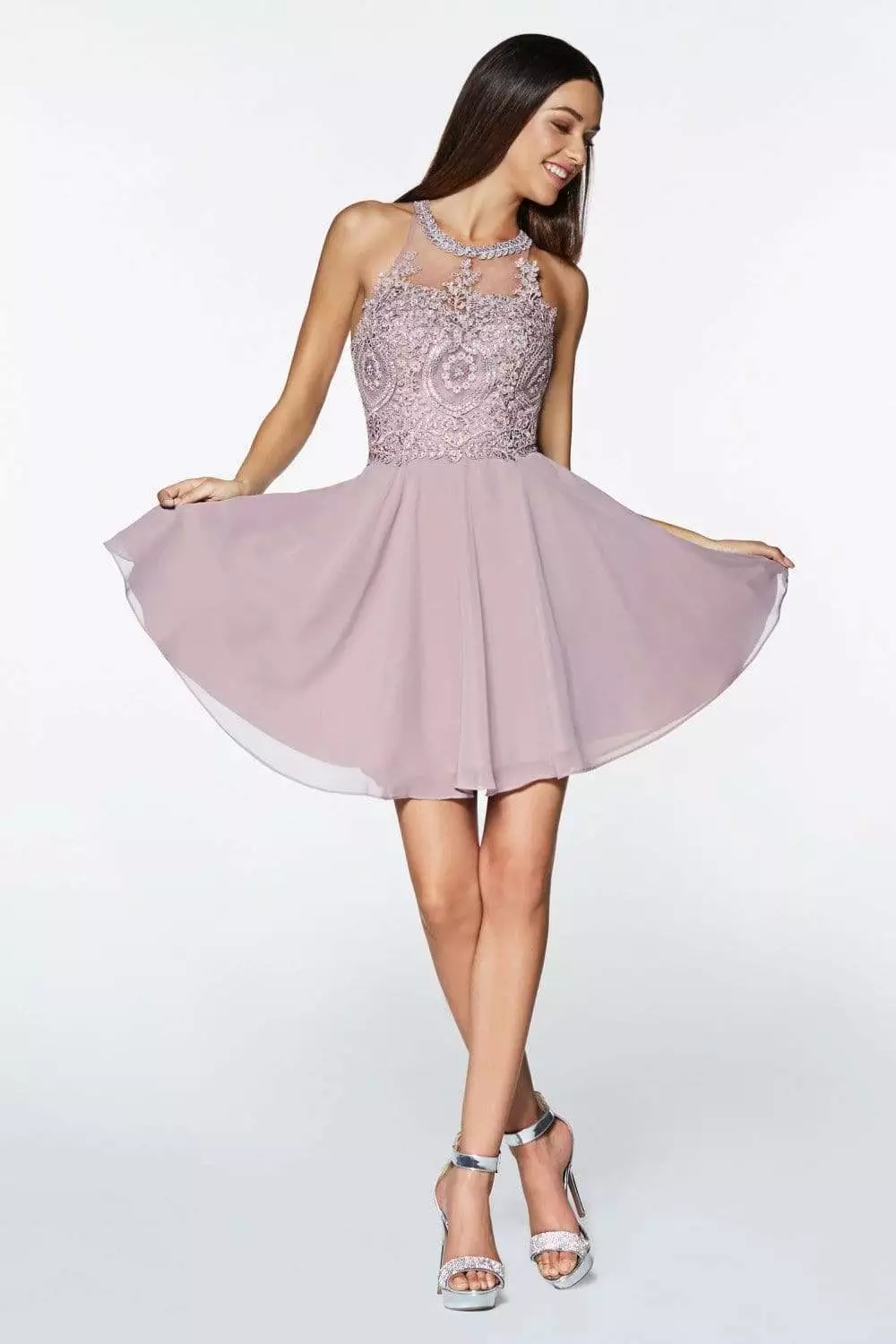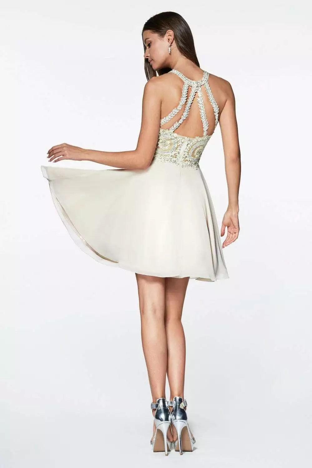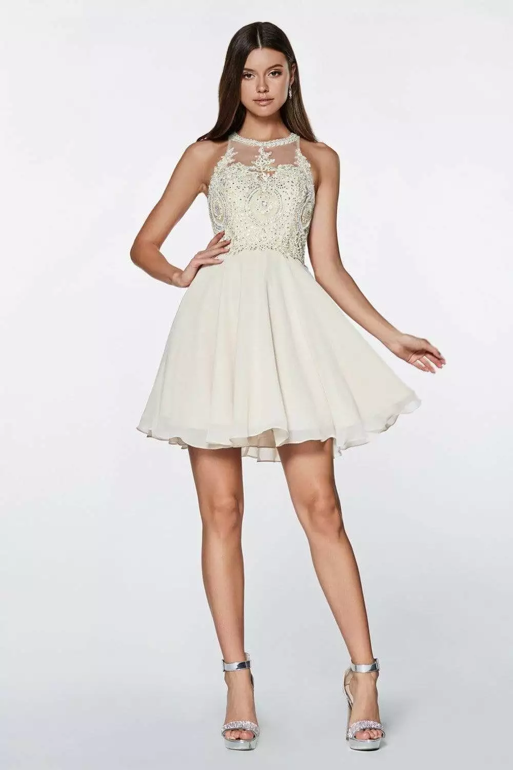 Charm everyone in this beautiful Cinderella Divine CD0141 short cocktail dress. Features a halter neckline with sheer yoke leading to the fitted bodice elaborated with a beaded lace pattern. The back appeals with leafy lace strappy details with center zipper closure leading to flowy A-line chiffon skirt. Glide into the party with an amazing flair in this Cinderella Divine dress.