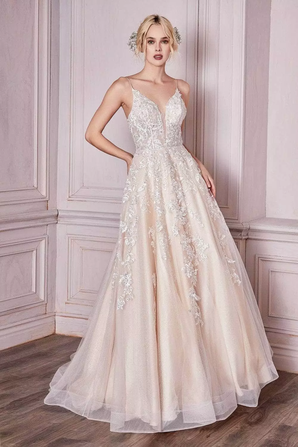 Envision a dramatic entrance that will fascinate him more as you walk in this Cinderella Divine CM320 bridal dress. This sleeveless bridal dress delights in a plunging V-neckline bodice with spaghetti strap support, embroidered tulle on the bodice to the half part of the skirt, and an equally enthralling scoop-shaped open back. An overlay of embroidered tulle gives fantastic volume to this ball gown wedding dress as it concludes with a sweep of train. This Cinderella Divine is as well-suited for a grand church as it is for an outdoor garden wedding. Whether you are looking for a unique prom dress to stand out, bridesmaid dresses or Mother of the Bride dress for that special day, or just an evening dress for a special night out, Cinderella Divine has your dress at the right price. Model is wearing Champagne color.