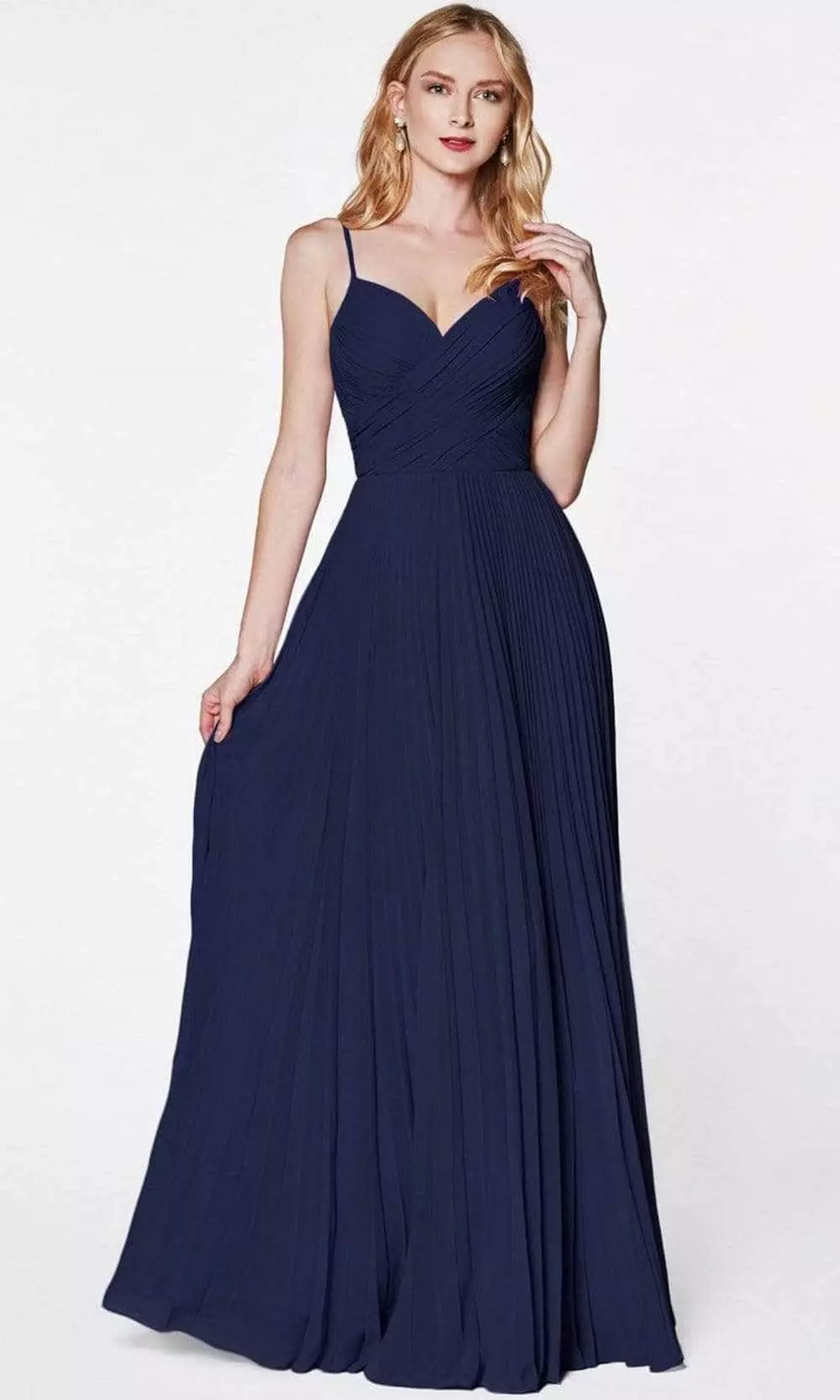 The sleeveless, finely ruched crisscross bodice charms with a sweetheart neckline held by spaghetti straps on the shoulders. The straight back has center zipper closure. Made in chiffon, the A-line skirt adorns with lavish fine pleats as it beautifully falls to a full-length hemline.