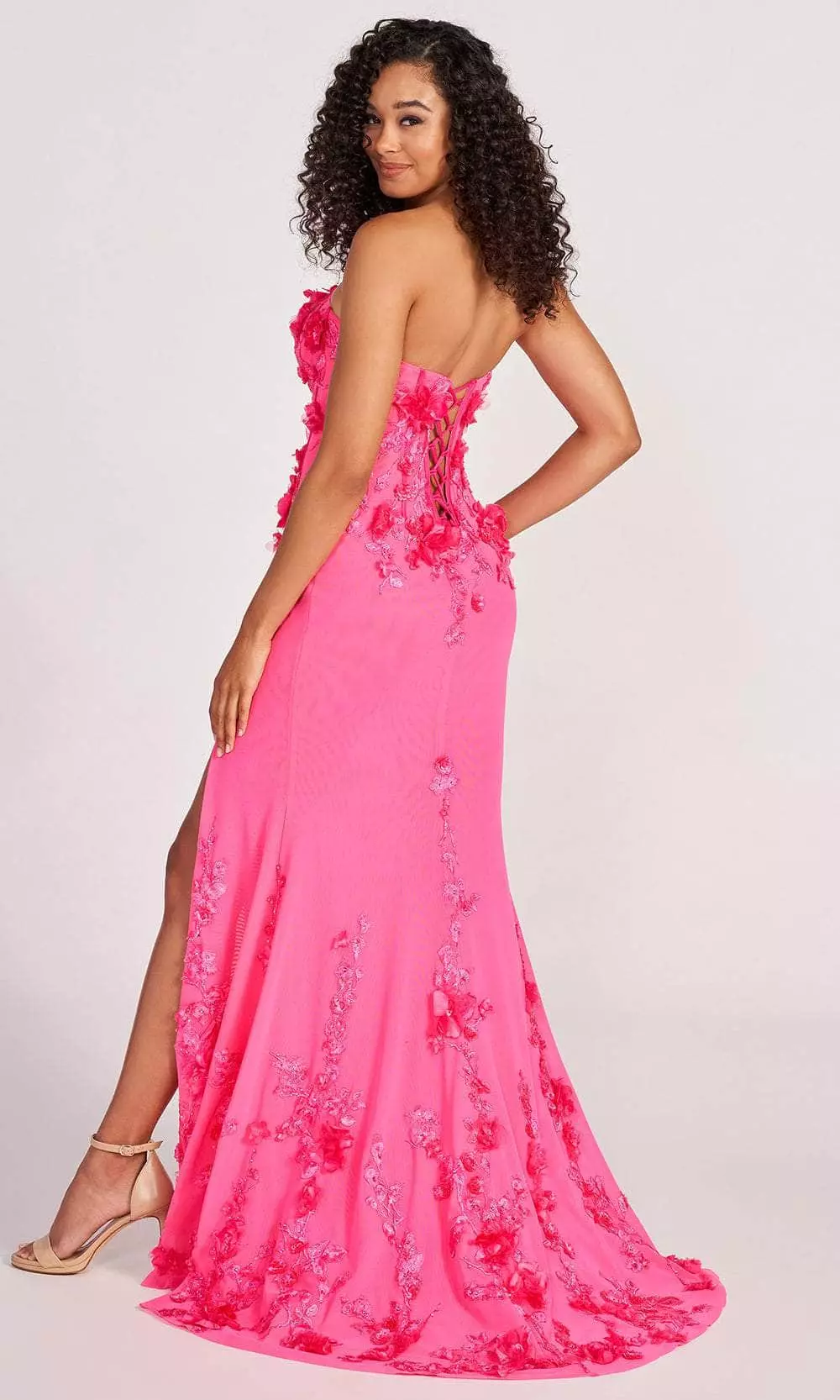From head to toe, you look gorgeous in this Colette CL2059 evening dress. This dress is made of stretch mesh fabric and is adorned with 3d flowers. Features a strapless design with a sweetheart neckline and has a high slit to show off your sexy leg. The skirt has a floor length hem and a straight shape. The back has a lace up style and includes separate straps. Step out in a gorgeous gown from Colette. The models are wearing the Lipstick and Midnight/Black colors