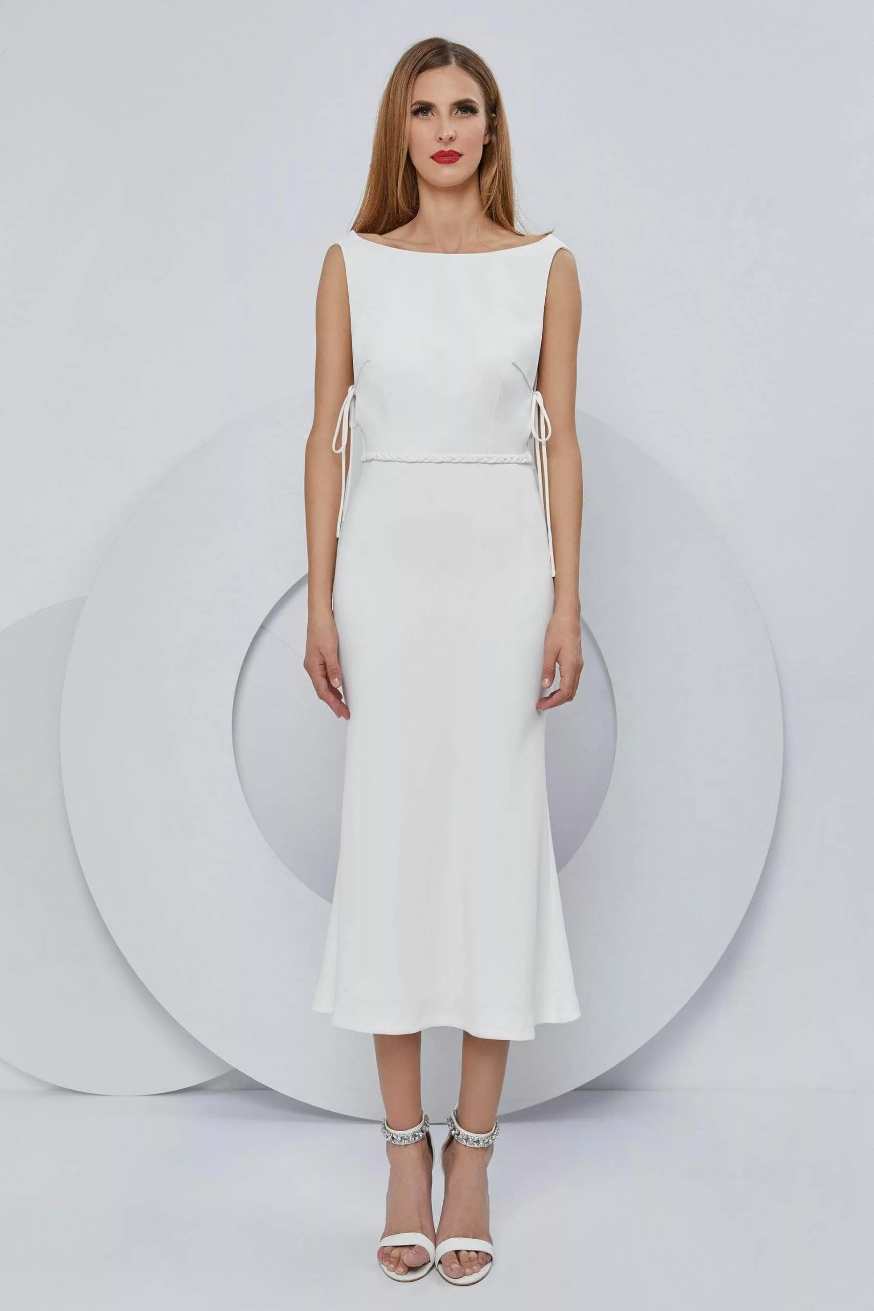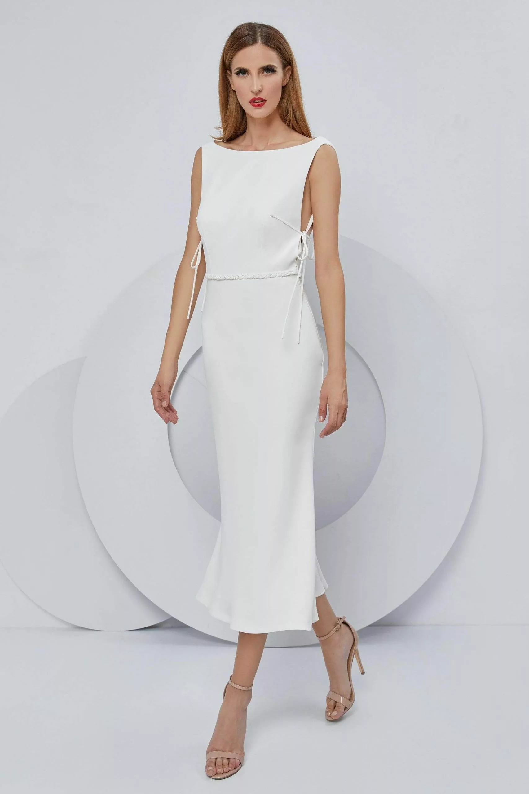 The fitted bodice features a bateau neckline, slight cap sleeves and cowl back as the skirt graces a sheath silhouette which finishes to the tea length hemline. Model is wearing the Ivory color.