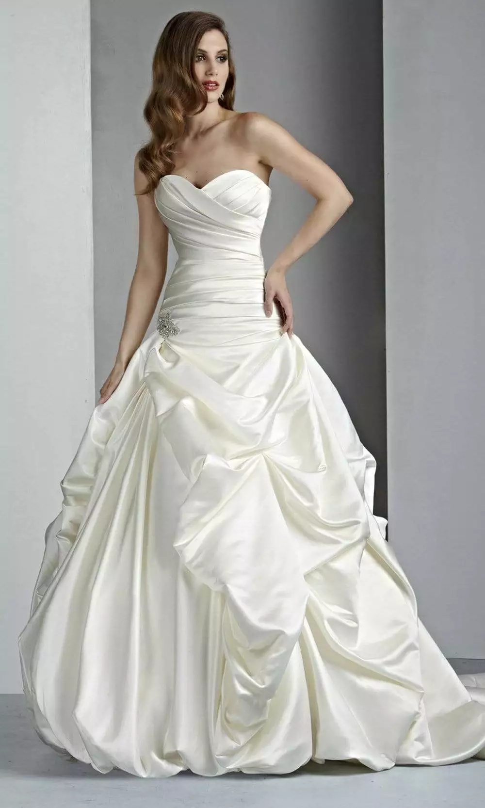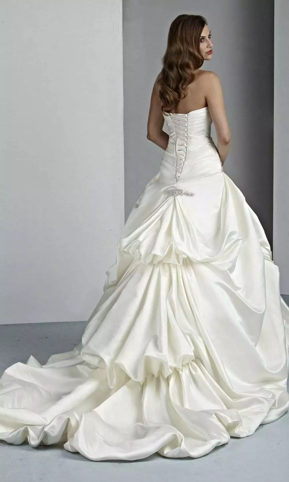 | Details: | Strapless, Pleat-Ornate, Ruching Details, Corset Open Back, Pickup Accent, Chapel Train |