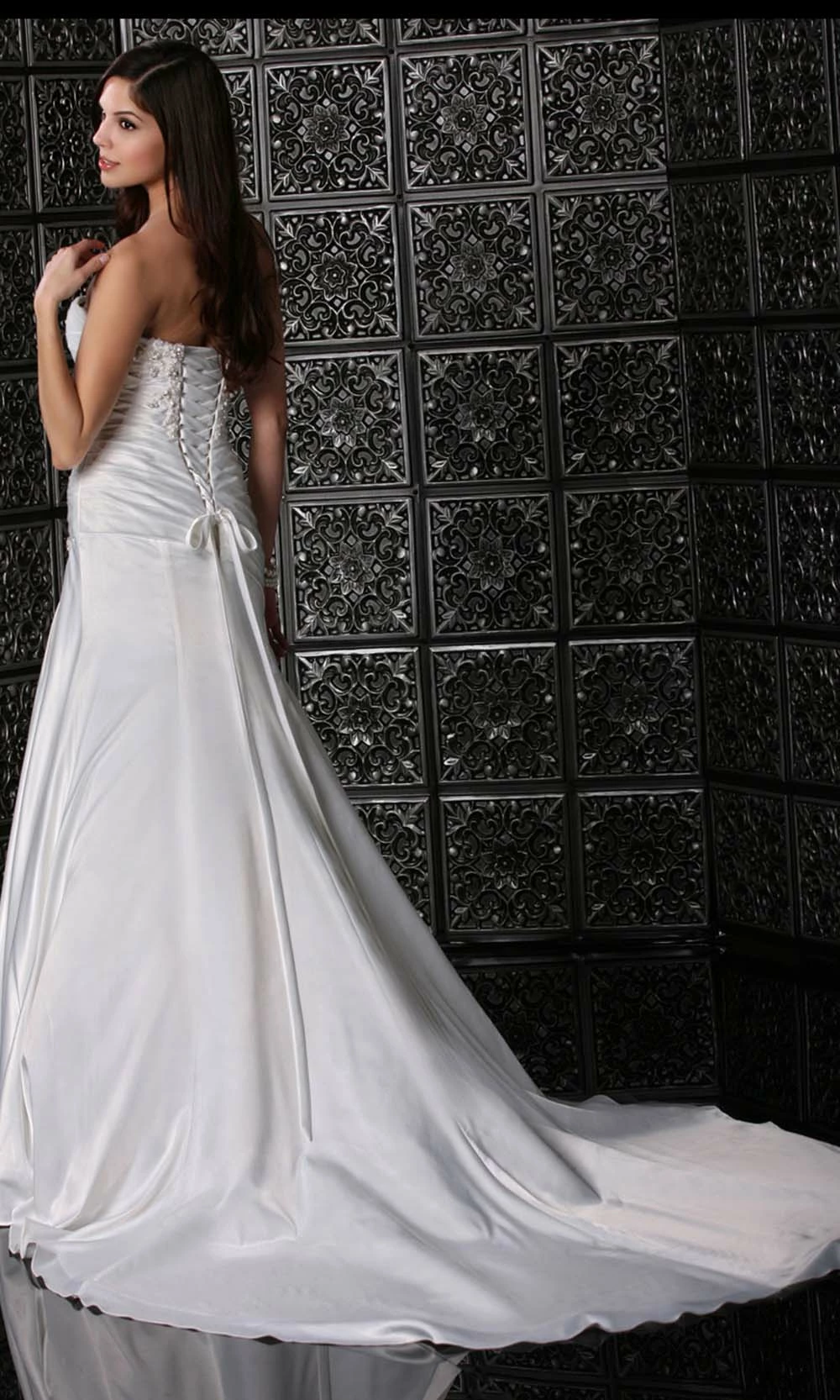 | Details: | Strapless, Beads, Pleats, Fitted bodice, Mid back, Lace-up tie, Court train, Satin |
