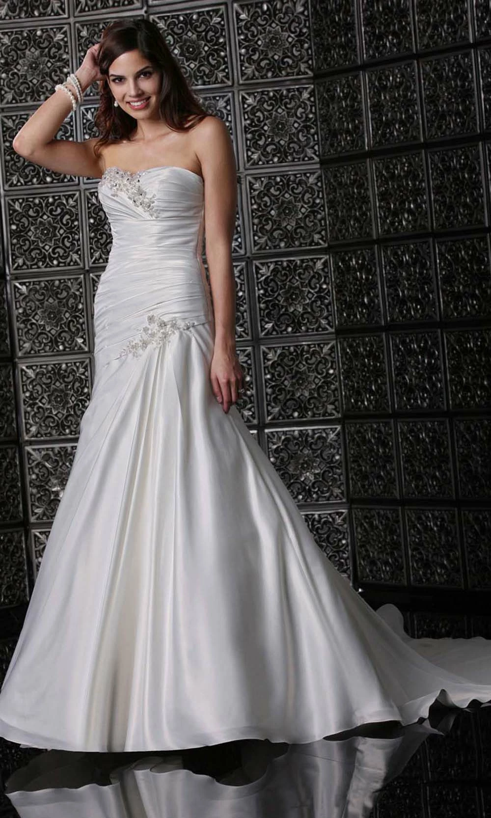 Da Vinci Bridal 50143 wedding dress offers an incredibly romantic look that makes it perfect for todayβs modern bride. Show off your Elegance in Satin A-Line Wedding Dress showcasing Strapless Sweetheart Neckline & Diagonal Ruched Drop Waist Bodice with shiny Beaded Accents at Bust, Hip & Corset Back. Asymmetrical Pleates Gathered Skirt Flows in Mermaid Style Chapel Length Train. Da Vinci Bridal wedding dress boasts undeniable glamour in a chic silhouette.