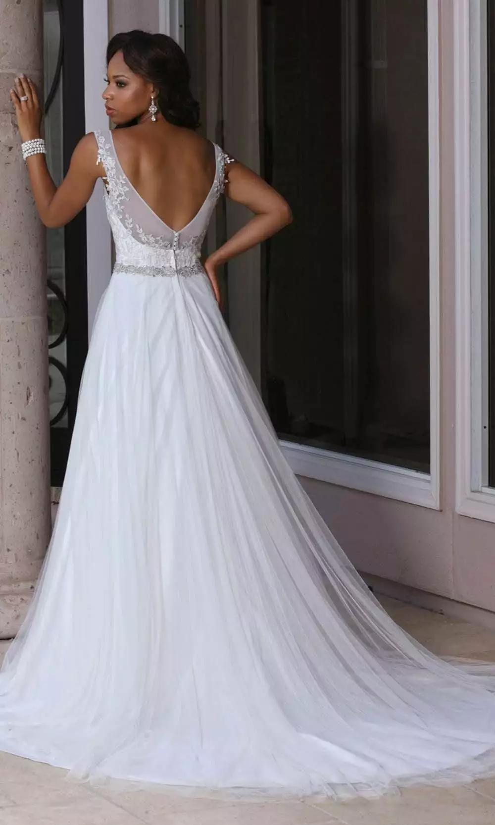 | Details: | Sleeveless, Illusion, Embroidery, Beads, Lace, Tulle, Open V back, Back zipper, Court train |