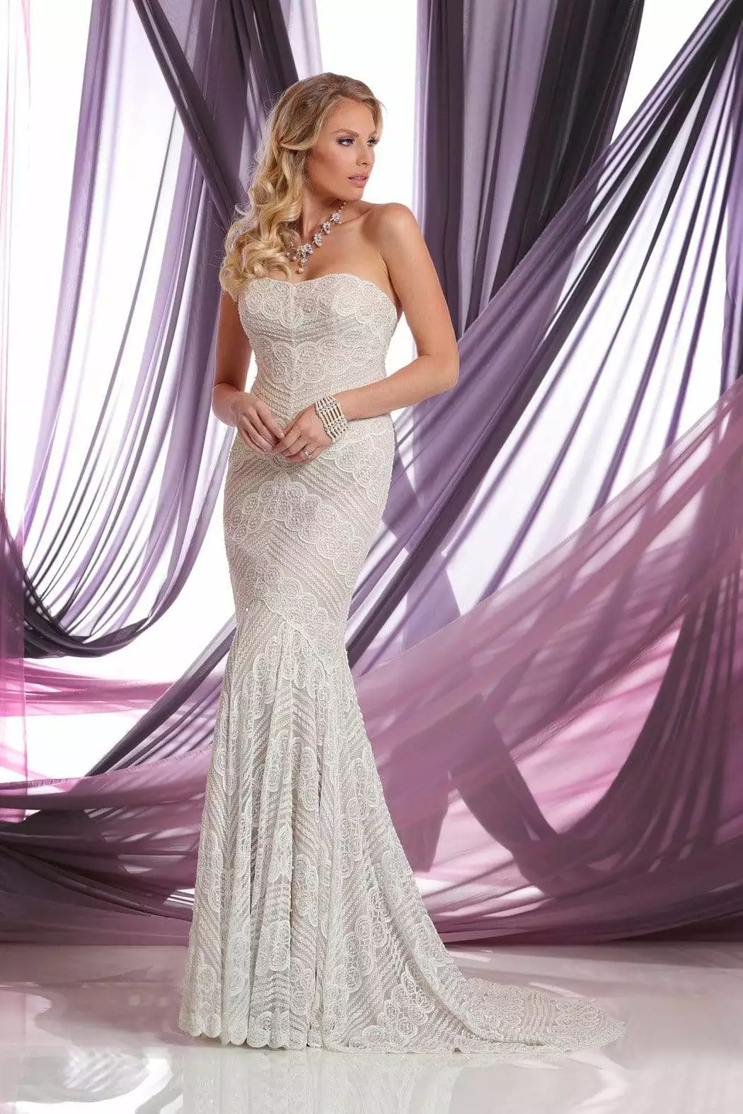 Show off your sophisticated style and soft curves in this beautiful bridal dress by Da Vinci Bridal 50409. This sophisticated wedding dress is styled in geometric patterned lace, fashioned with a strapless, modified sweetheart neckline and a mid-open back with covered button accenting the center. The bodice is sculpted to define a form-flattering figure while the skirt fits and flares in a slim mermaid style and finishes with a mini-chapel train. This design by Da Vinci Bridal Bridal is proud to be unpretentiously elegant.